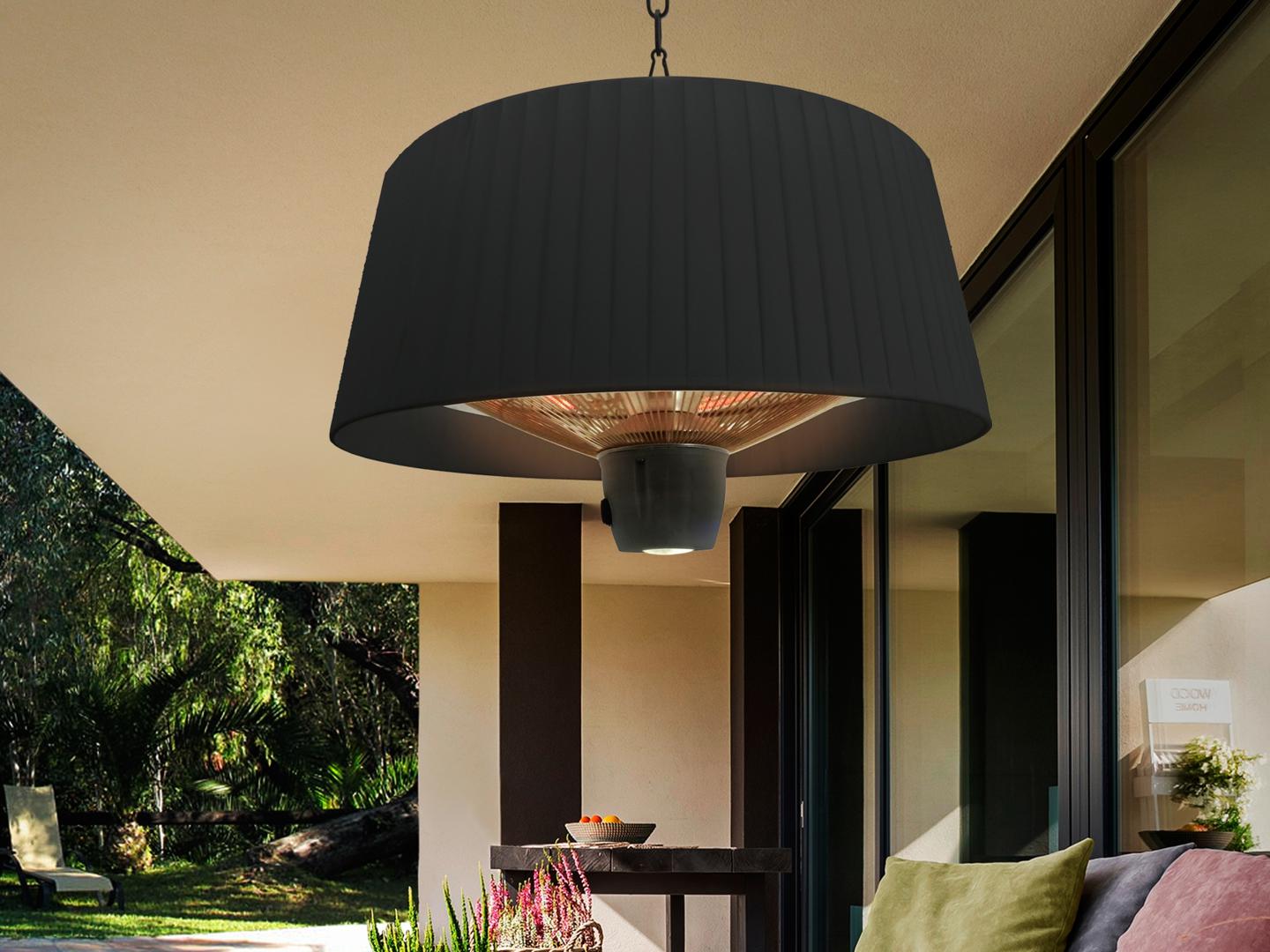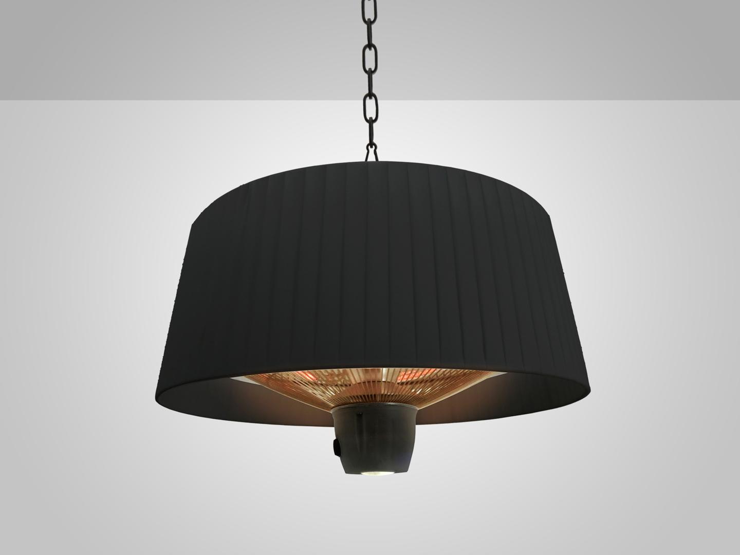 Электронагреватель для потолочной установки, подвесного типа. Изготовлен из металла и пластика, окрашен в черный цвет. Черный тканевый плафон со складками. Галогенное отопление мощностью 600/900/1500 Вт. Светодиодная лампа мощностью 1 Вт. Дистанционное управление. Кабель: 1,8 м. IP44.