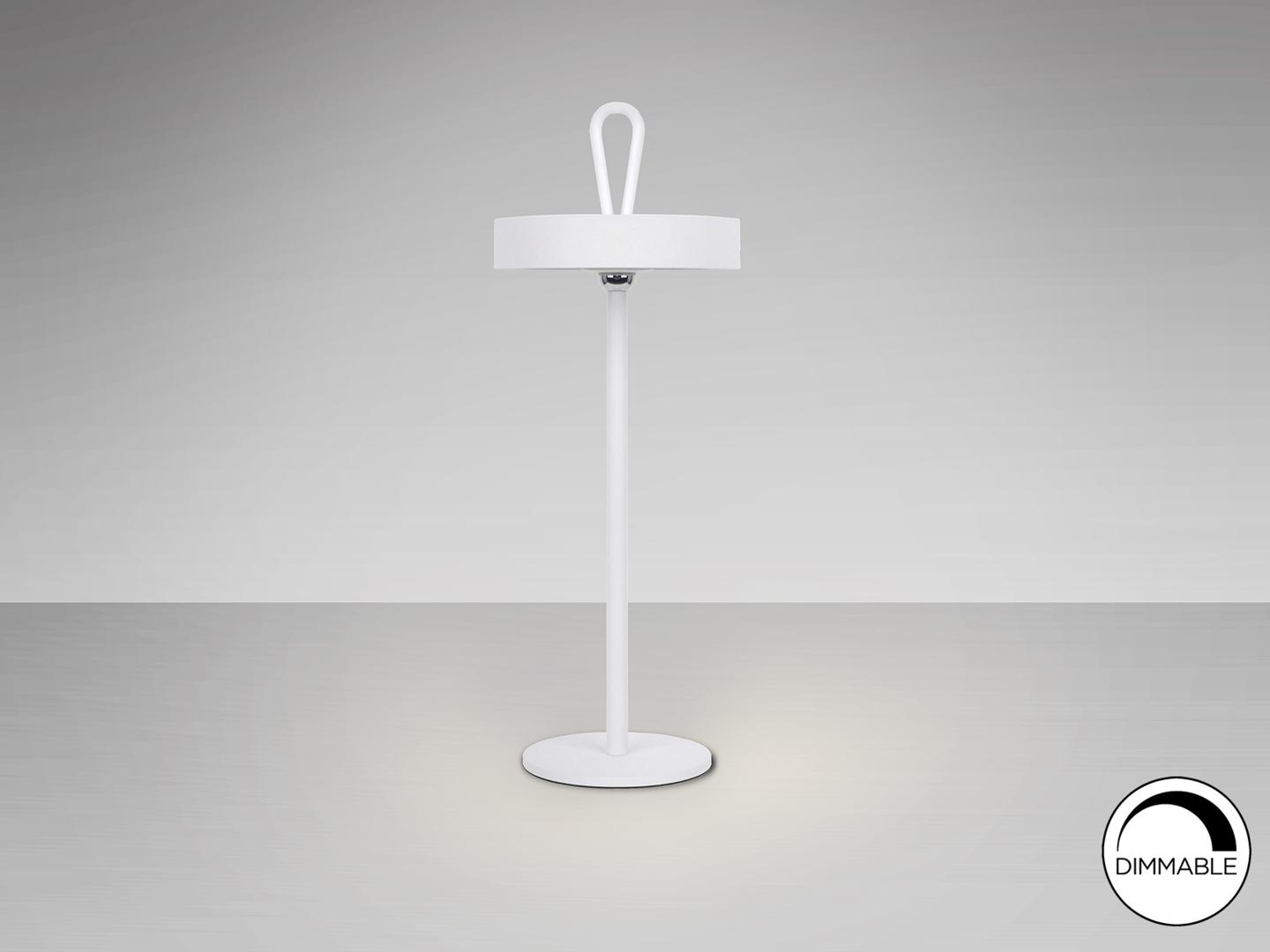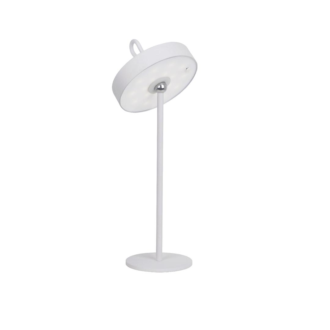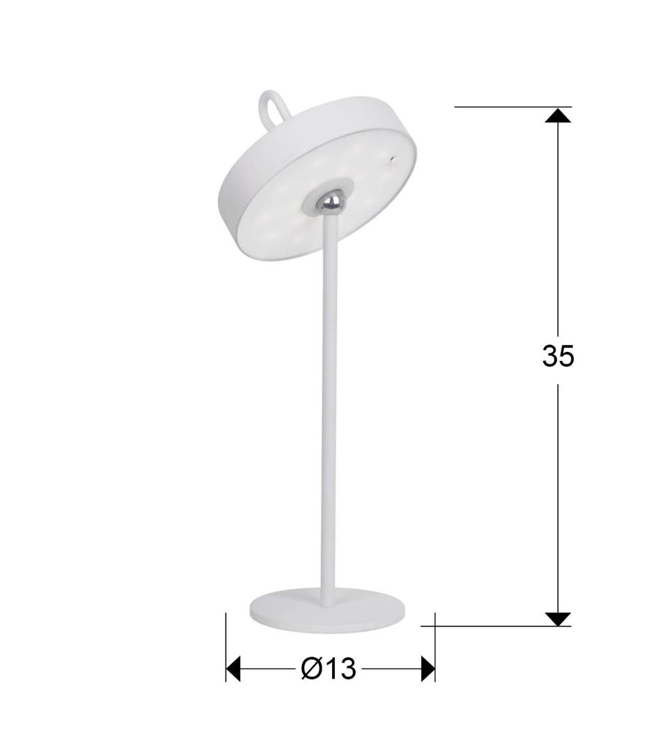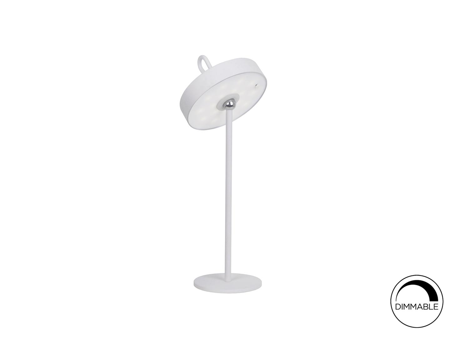 Светодиодная настольная лампа для внутреннего и наружного использования, переносной абажур с силиконовой ручкой и магнитной подставкой. Изготовлен из металла белого цвета и опалового акрила. Рассеиватель. Светодиод 2,5 Вт, 140 лм, 3000 К. ДИММИРУЕМАЯ. IP54.
