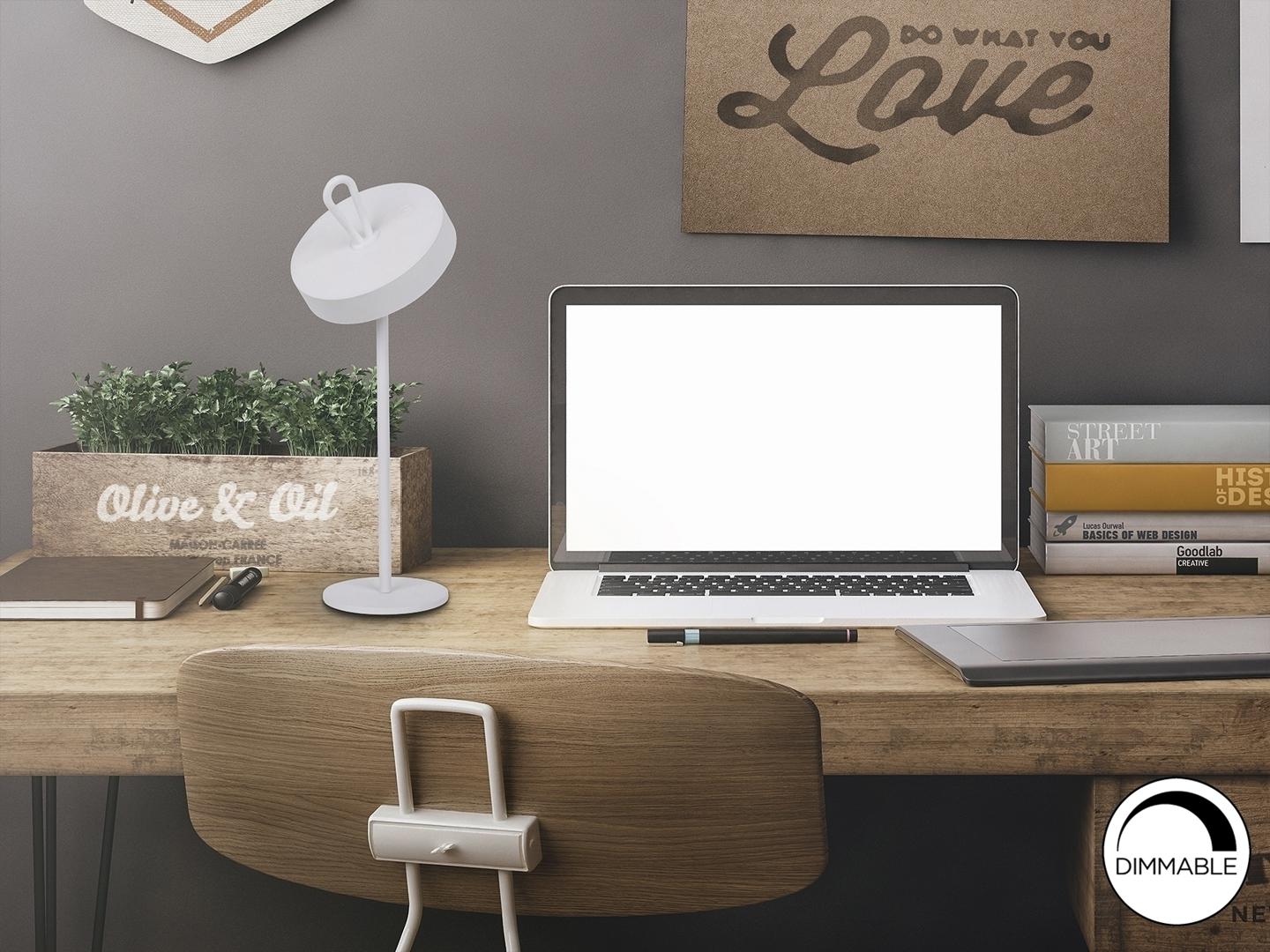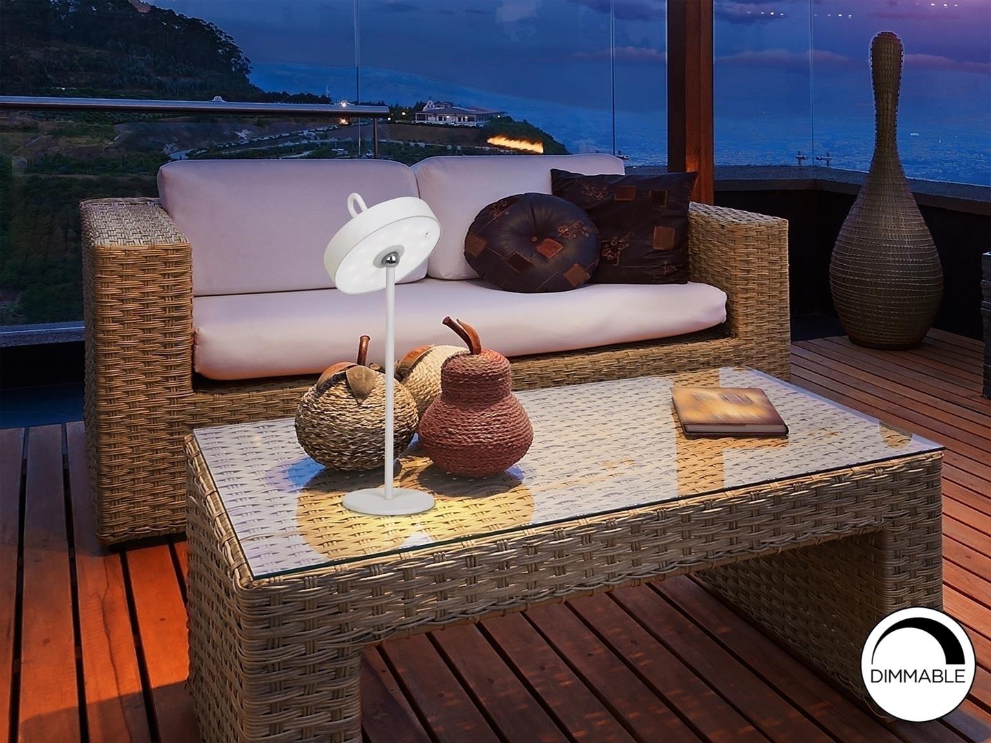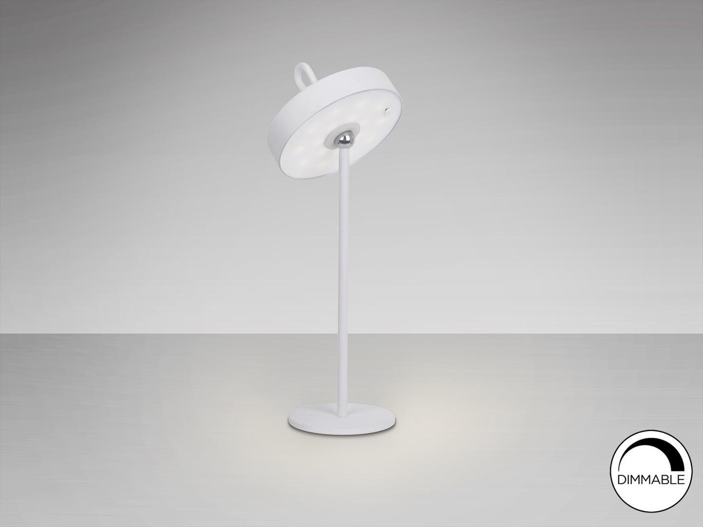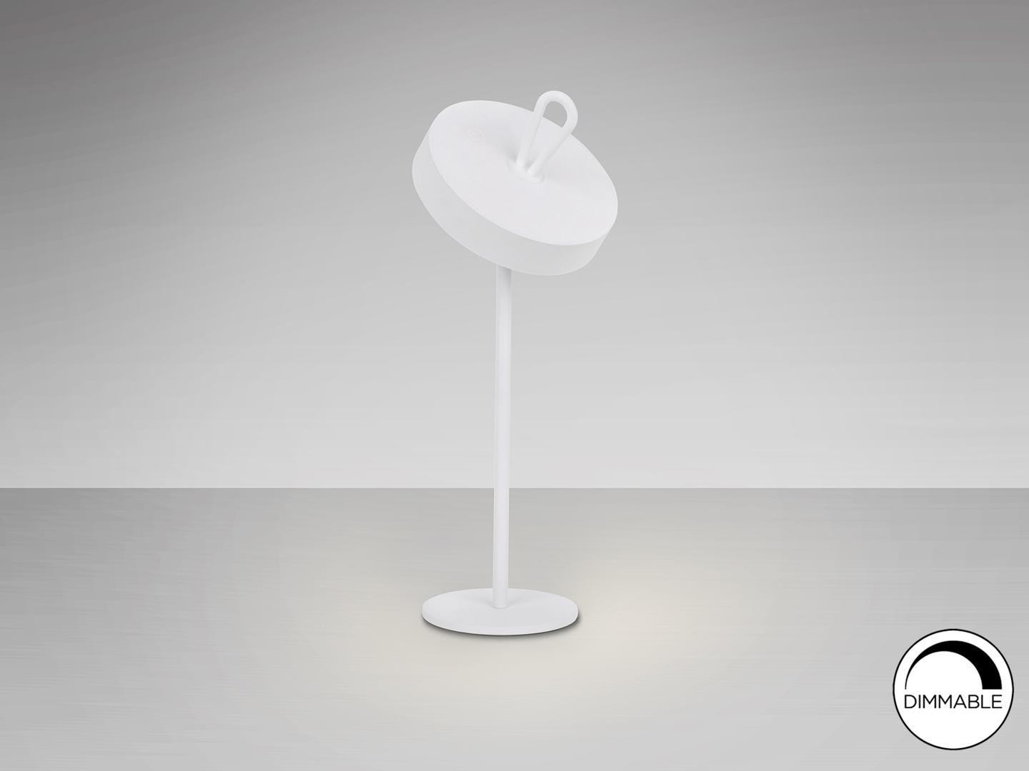 Светодиодная настольная лампа для внутреннего и наружного использования, переносной абажур с силиконовой ручкой и магнитной подставкой. Изготовлен из металла белого цвета и опалового акрила. Рассеиватель. Светодиод 2,5 Вт, 140 лм, 3000 К. ДИММИРУЕМАЯ. IP54.