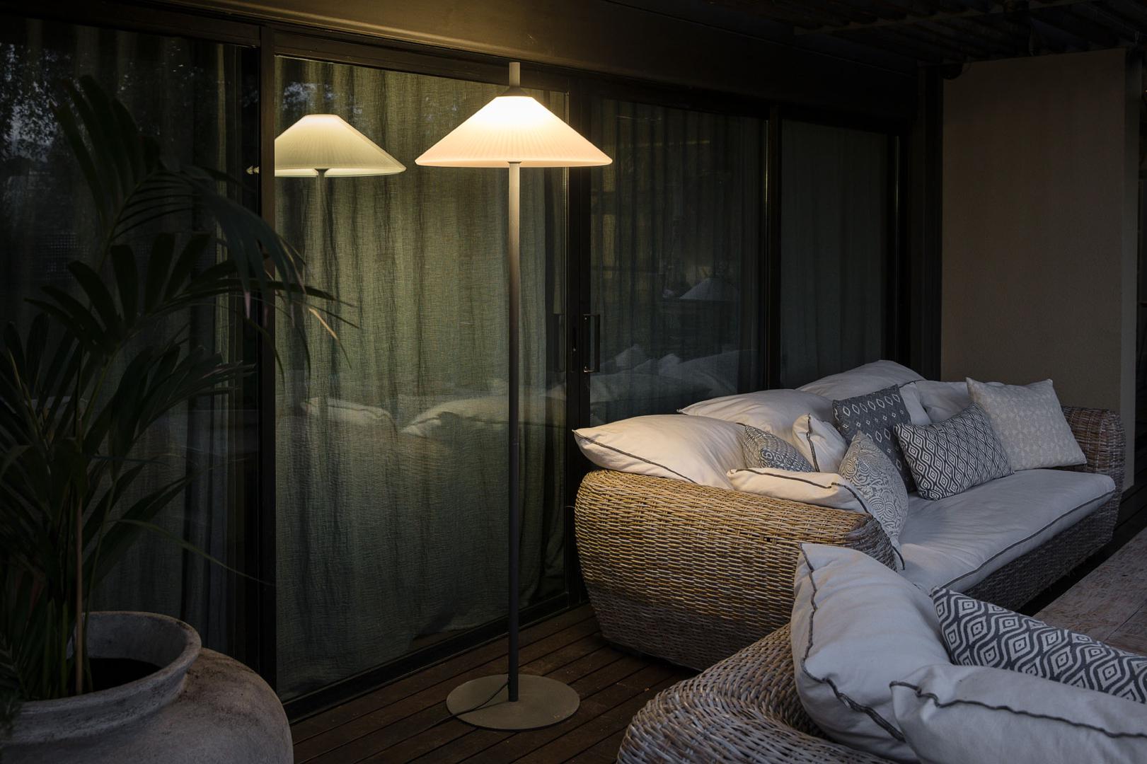 SAIGON - это набор дизайнерских ламп Nahtrang для наружного освещения. Для него характерны простота и чистые формы. Торшер для гостиной с матовым белым плафоном R55 толщиной 2 метра.