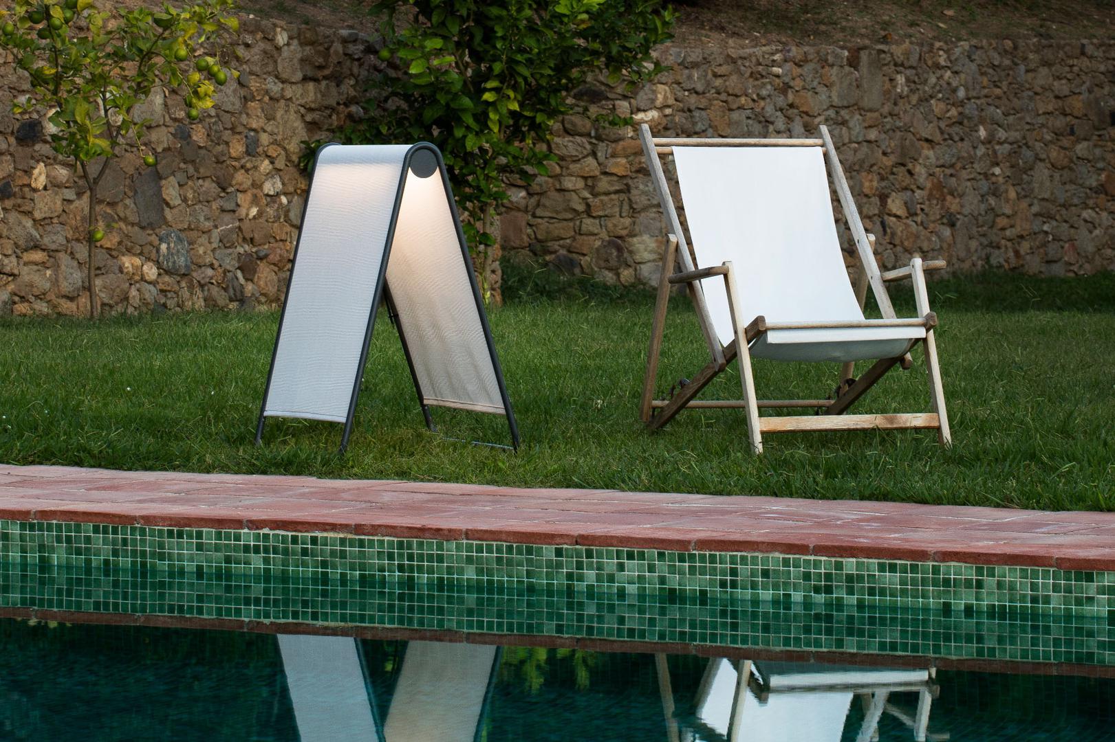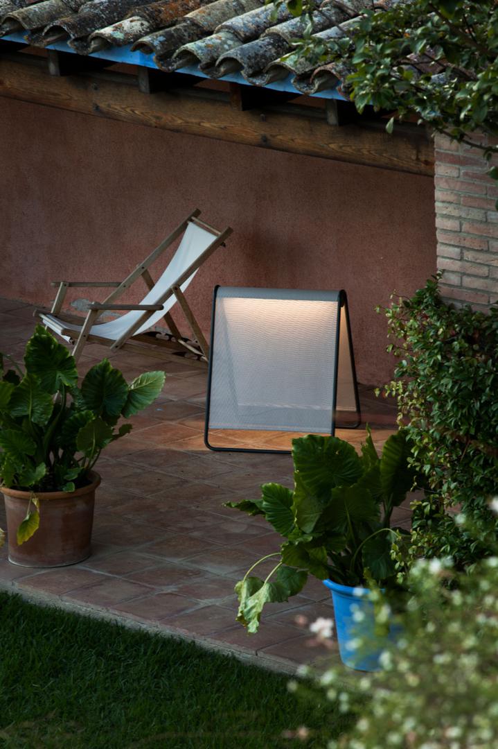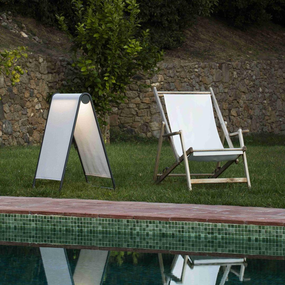 CADAQUÉS - это напольный торшер, разработанный Faro Lab. Его структура напоминает треугольник, а теплый луч света проецируется прямо из середины двух плафонов. Он изготовлен из алюминия и текстиля, высококачественного материала, который очень хорошо сопротивляется перепадам температур, а также используется для изготовления пляжных шезлонгов. У него есть аксессуар для крепления лампы к земле и один для увеличения длины кабеля. Также в синей отделке.