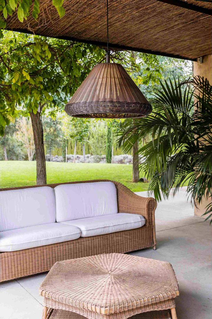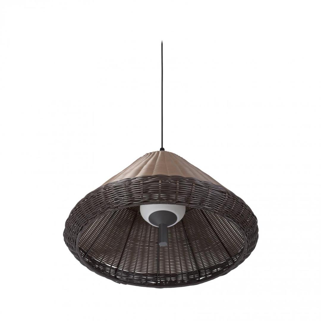SAIGON - это набор дизайнерских ламп Nahtrang для наружного освещения. Для него характерны простота и чистые формы. Это коричневый подвесной светильник W70 cone cap с абажуром. Абажур изготовлен из синтетического плетения.