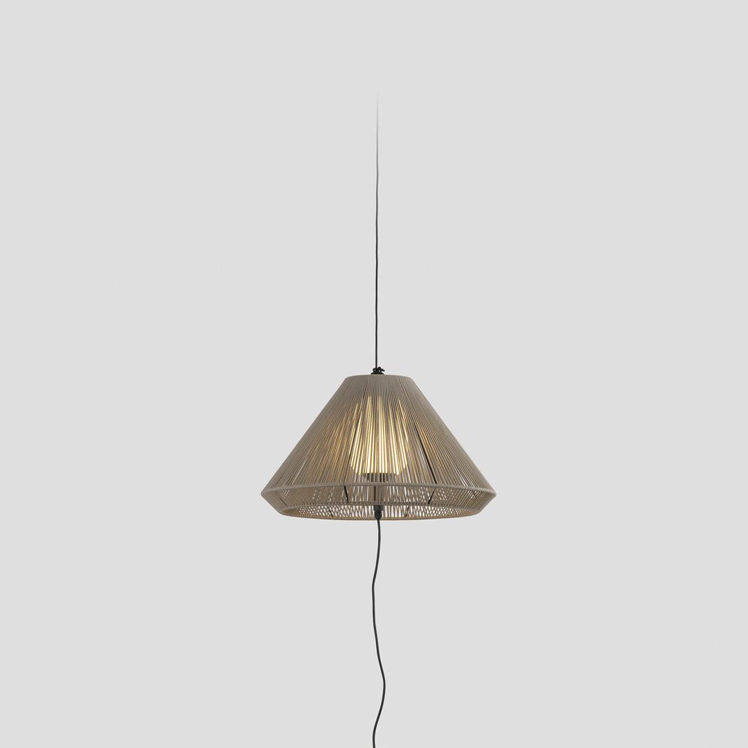 SAIGON — это набор дизайнерских светильников Nahtrang для наружного освещения. Он характеризуется простотой и чистыми формами. Это переносная и подвесная лампа с бежевым колпачком с отверстием. Абажур изготовлен из веревки, которая пропускает свет, создавая красивый световой эффект.