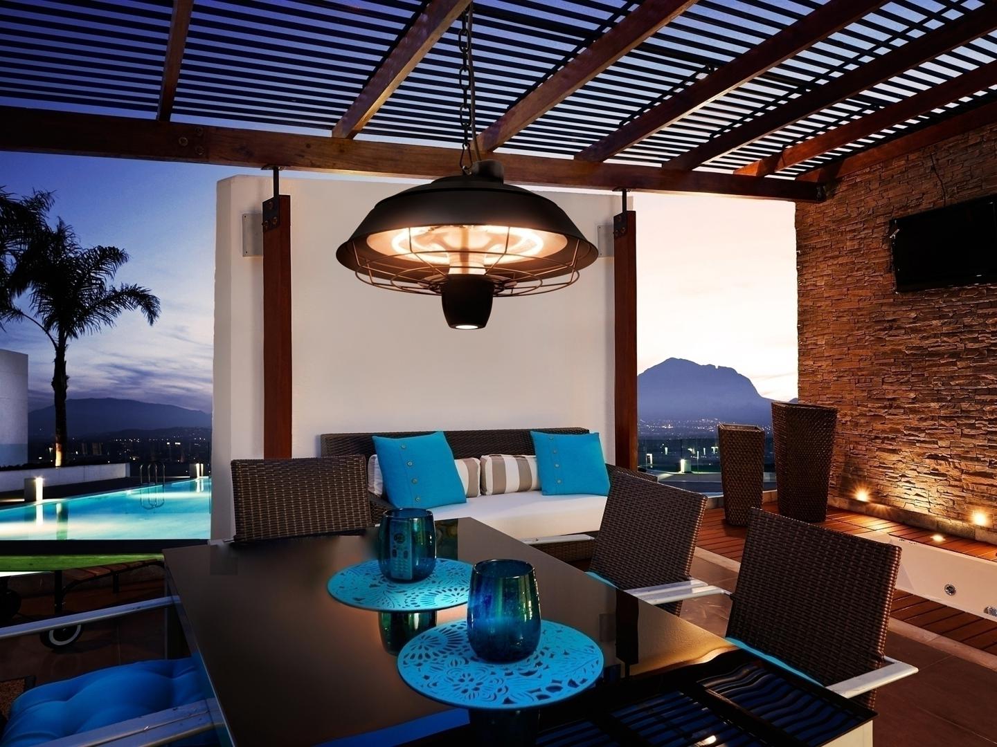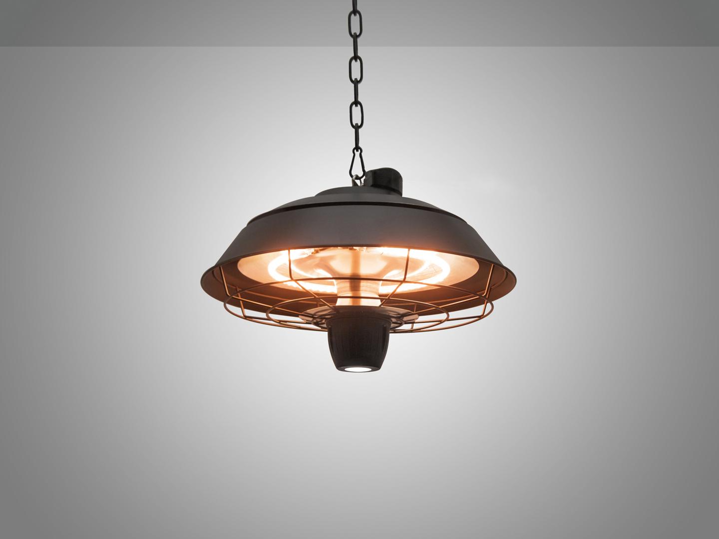 Электронагреватель для потолочной установки, подвесного типа. Изготовлен из металла и пластика, окрашен в черный цвет. Галогенное отопление мощностью 600/900/1500 Вт. Светодиодная лампа мощностью 1 Вт. Дистанционное управление. Кабель: 1,8 м. IP44.