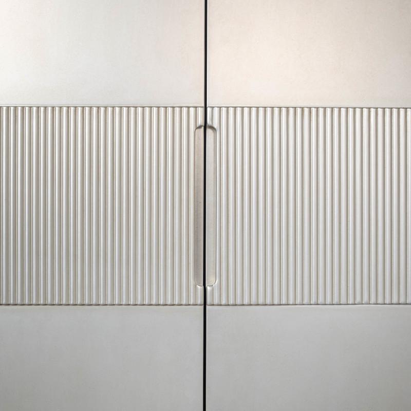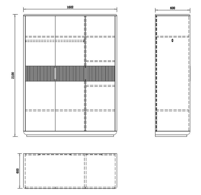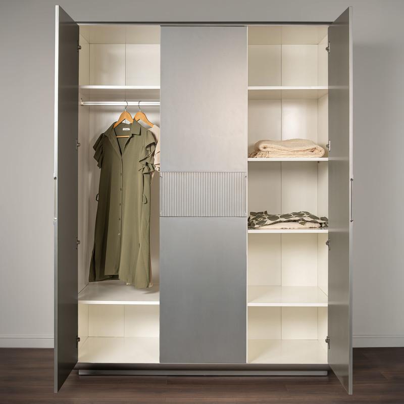 Гардероб Rimini от итальянского бренда Fratelli Barri с 3 распашными дверцами в лаконичном дизайне. Выполнен из высококачественного МДФ. Отделка - лак, цвет - патинированное серебро. Внутри отделка белого цвета. Ручка-выемка на фасаде. Рифленые вставки на фасадах. Внутреннее наполнение: слева широкое отделение с 2-мя полками и штангой, 4 полки в модуле справа. Данный предмет является частью коллекции для спальни. В коллекции представлены кровать, тумбочки и комод в аналогичном дизайне и отделке.