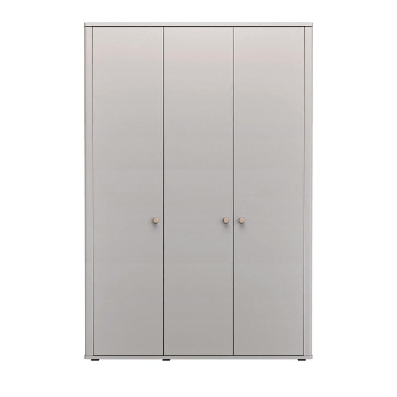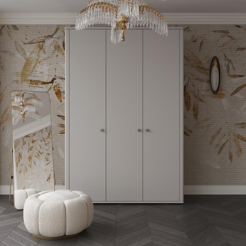 Трехстворчатый гардероб от итальянского бренда Fratelli Barri. Высота гардероба 241,5 см позволяет разместить большое количество одежды. Гардероб имеет лаконичный дизайн, что позволяет его интегрировать в интерьеры разных стилистик - от современного до прованс. Закругленные углы базы делают гардероб эргономичным и безопасным. Корпус и фасады изготовлены из высококачественного МДФ. Отделка - матовый лак светло-серого оттенка. Ручки из металла, тип кнопка, цвет бронза. Ящики с направляющими скрытого монтажа с системой плавного закрывания soft closing. Внутреннее наполнение гардероба: -Левая часть (1 дверь) - 5 полок. -Правая часть (2 двери) - 2 штанги и верхняя полка. Наполнение гардероба фиксированное.