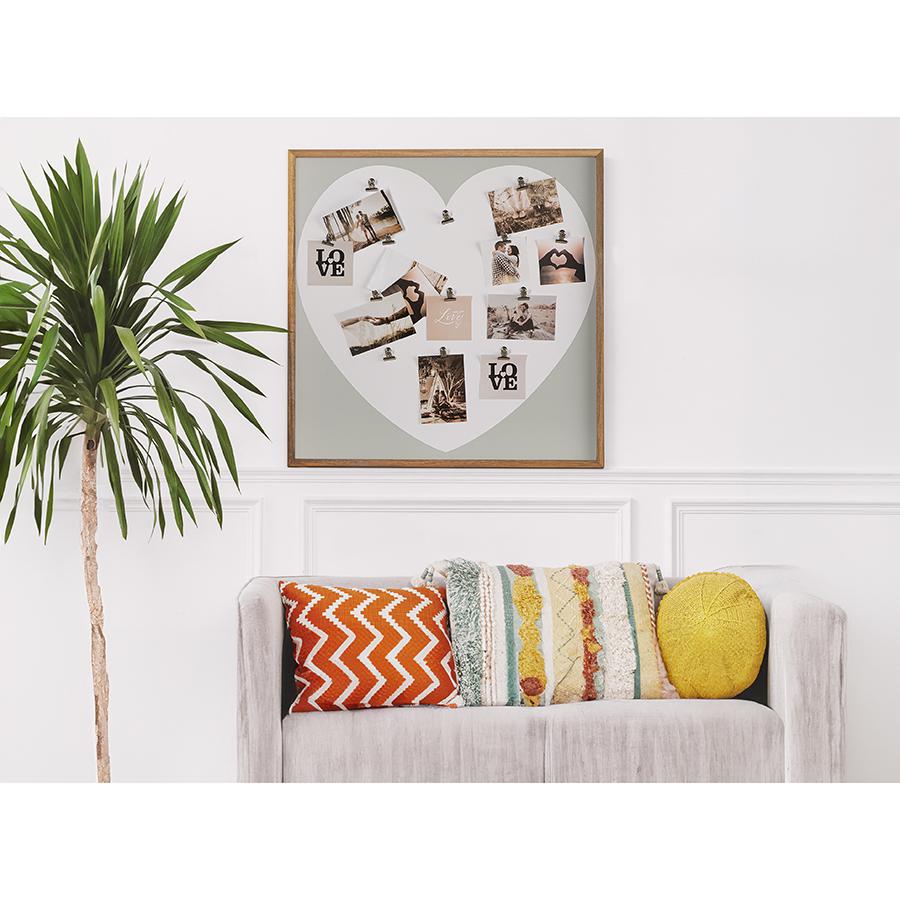 Рамка My memories – функциональный декор с дизайном в форме сердца, который добавит в интерьер ощущение тепла и уюта. Ее можно использовать для демонстрации фотографий, а также в качестве мудборда. Особенности и преимущества: - Основание рамки выполнено из МДФ, что обеспечивает ей прочность и долгий срок службы. - В комплект входят 13 металлических прищепок для надежного крепления фотографий. Материалы: МДФ, бумага, железо. Размеры: 58х58 см. Пыль и загрязнения удалять при помощи мягкого влажного материала.
