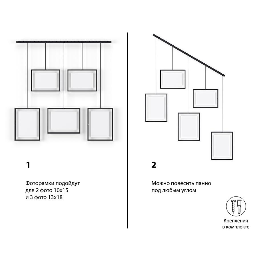 Панно Exhibit – прекрасный способ освежить интерьер и создать в помещении уютную атмосферу. Конструкция имеет вид горизонтальной планки, к которой подвешены фоторамки разных размеров, удерживаемые при помощи специальных зажимов. Возможность чередования изображений с альбомной и портретной ориентацией позволяет проявлять фантазию и создавать свои уникальные сюжеты из фотографий, открыток, писем и любых других предметов. Такой оригинальный коллаж отлично смотрится на стене в любой из комнат, а также подходит для украшения лестничного пролета. Для установки панно потребуется просверлить в стене всего два отверстия. В наборе: - 2 рамки для фотографий: 10х15 см. - 3 рамки для фотографий: 13х18 см. Материалы: сталь, стекло. Размеры композиции: 66х69 см. Цвет: черный. Количество рамок: 5 шт. Пыль и загрязнения с поверхностей можно удалять при помощи мягкого влажного материала. Запрещается использование абразивов и агрессивной бытовой химии.