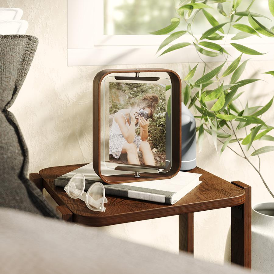 Фоторамка Bellwood добавит природное очарование в любое пространство, будь то жилая комната, кабинет или офис. Центральная часть рамки плавно вращается, что дает возможность демонстрировать поочередно две фотографии. Специальная конструкция позволяет менять параметры ориентации и размещать изображения как в портретном, так и альбомном режиме. Сочетание натуральной древесины и стекла обеспечивает изделию практичность, долговечность и привлекательный вид. Материалы: бук, стекло, тополь, сталь. Размеры: 19х5х24 см. Цвет: состаренный орех. Пыль и загрязнения с поверхностей можно удалять при помощи мягкого влажного материала. Запрещается использование абразивов и агрессивной бытовой химии.