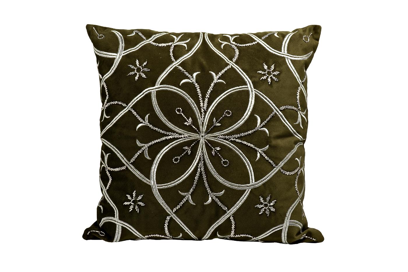 description-full - Для тех, кто ценит классические симметричные орнаменты, отлично подойдет эта декоративная подушка на кровать в спальню или в качестве украшения дивана. На зеленом фоне изображен серебристый узор, напоминающий мандалы, – способствует снятию напряжения после рабочего дня, настраивает на приятный отдых, расслабление, созерцание. Классическая квадратная декоративная подушка зеленого цвета –«изюминка» современного интерьера.