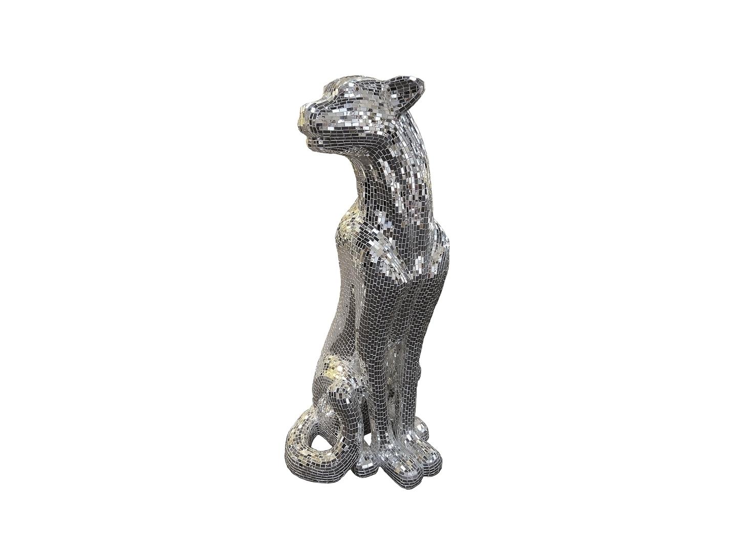 Декоративная фигура сидящего леопарда из стеклопластика, покрыта мозаикой из прямоугольных полосок серебристого зеркального стекла на белом фоне. Поворот головы направо.