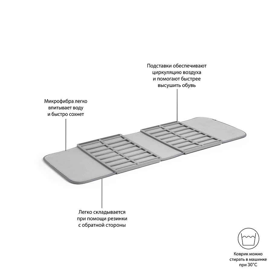 Удобный коврик-сушилка для обуви из ультра-абсорбирующей микрофибры – стильное и современное решение проблемы мокрой обуви. Практичный аксессуар поможет сохранять обувь и пол в прихожей сухими. Коврик легко складывается и раскладывается, на нем также есть две специальных подставки для сильно промокшей обуви. Материал: полиэстер, полипропилен. Размеры: 90х33х2 см.