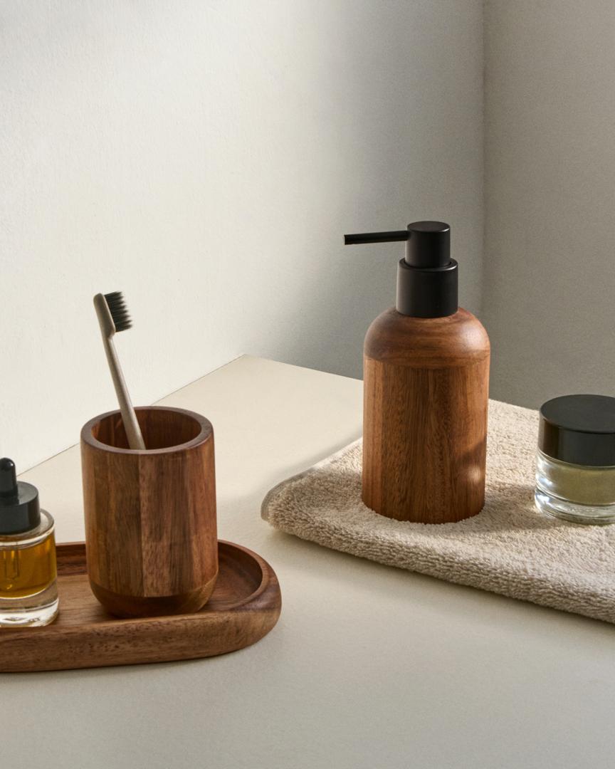 Набор аксессуаров Senda от фабрики La Forma (ex Julia Grup) – уникальные детали для вашей ванной комнаты. Набор аксессуаров Senda – смелое решение для ванной комнаты. Кажется, что древесина не способна противостоять негативному воздействию влаги? Только не обработанная акация, из которого создана Senda. Ваша дружба будет надолго, а обстановка приобретет индивидуальность. В коллекцию Senda входит три предмета. Это дозатора для мыла, стакан для зубных щеток и поднос. Материал изготовления – натуральный массив акации, который защищен от влаги специальным прозрачным покрытием. Поэтому изделия не будут портиться от влаги, терять свою природную прочность и долговечность. Кнопка дозатора сделана из металла с черной матовой отделкой, которая защищает от коррозии и придает эстетичный вид. Чтобы изделия долго сохраняли свой первоначальный вид, необходим бережный уход. Их следует чистить деликатным способом и не мыть в посудомоечной машине. В каталоге каждый предмет представлен отдельно. Но мы рекомендуем приобрести полную коллекцию.