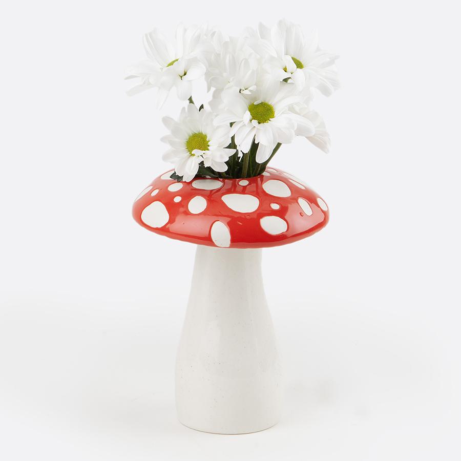 Ваза Amanita добавит в любое пространство свежий акцент и нотку иронии. Разместите в ней букет из живых цветов или сухоцветов, и ваш интерьер заиграет новыми красками! Особенности и преимущества: - Изготовлена из устойчивой к износу и экологичной керамики. - Имеет необычный дизайн в виде мухомора, который привлекает внимание. - Подходит для сухоцветов и живых цветов. Материал: керамика. Размер: 13,5х13,5х19 см. Рекомендуется мыть вручную при помощи мягкой губки. Запрещается использование абразивных материалов и агрессивной бытовой химии.
