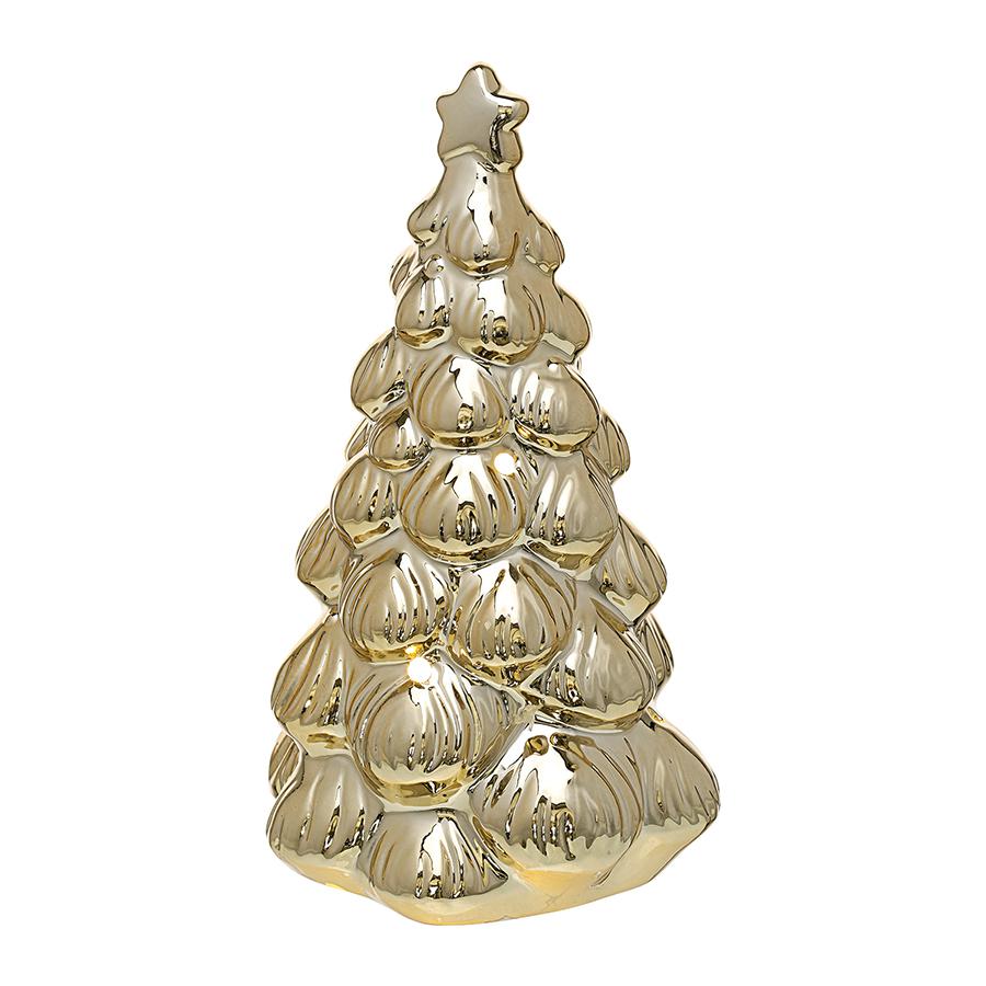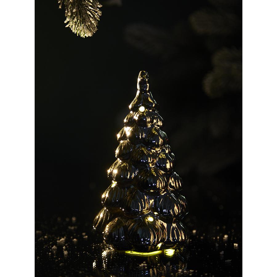 Декор с подсветкой Fairy glim из коллекции New Year Essential – то, что нужно для создания новогоднего настроения. Эта ёлочка, сверкающая как чистое золото, привлечет в ваш дом настоящие чудеса и поможет в исполнении заветных желаний. Особенности и преимущества: - Высококачественный фарфор гарантирует долговечность изделия, позволяя вам наслаждаться его красотой на протяжении многих лет. - Встроенная подсветка с мягким свечением подчеркивает детали, делая дизайн живым и интересным. - В комплект входят три батарейки LR44. Материал: фарфор. Размеры: диаметр низа – 10,2 см; диаметр верха – 3,4 см; высота – 17,5 см.
