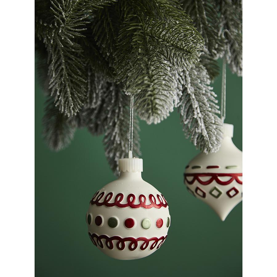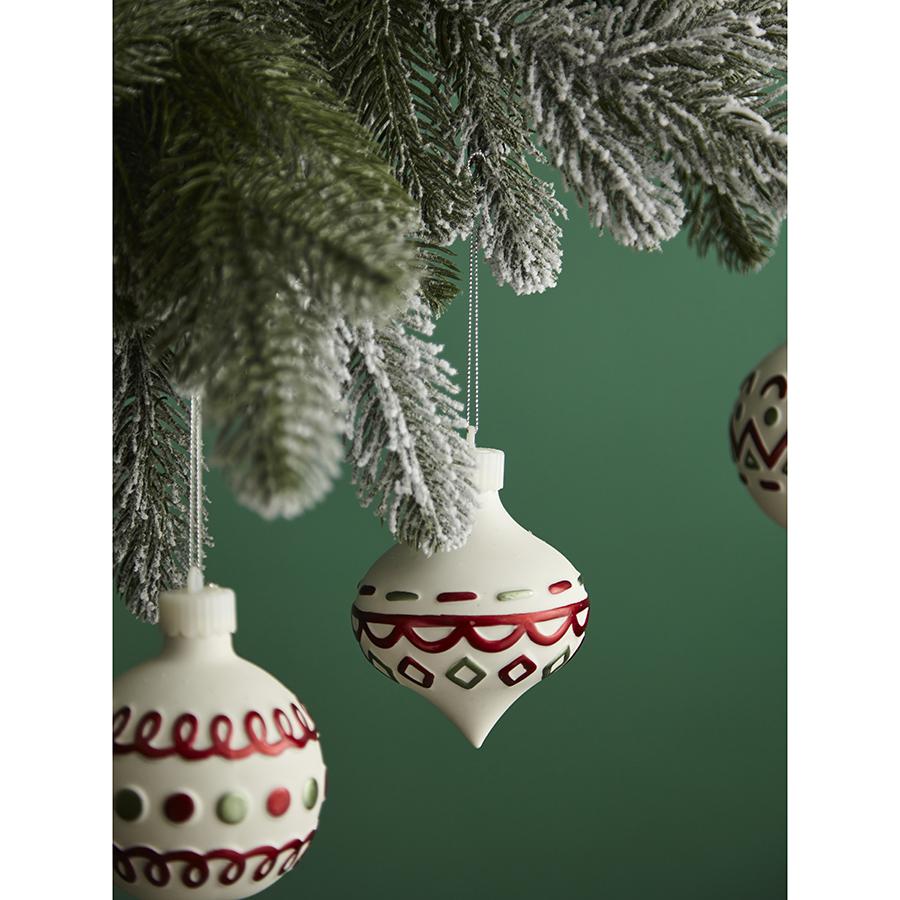 С набором украшений Festive Embroidey из коллекции New Year Essential ваша ёлка превратится в настоящее произведение искусства. Эти игрушки из фарфора эффектно выделяются на фоне других не только благодаря изящному дизайну, но и за счет наличия подсветки. Они, словно волшебные артефакты, наполняют пространство ощущением радости в ожидании новогодних чудес. Особенности и преимущества: - Высококачественный фарфор гарантирует долговечность изделий, позволяя вам наслаждаться их красотой на протяжении многих лет. - Украшения оснащены веревочками – вы можете легко размещать их на еловых ветках и предметах интерьера. - Наличие подсветки позволяет этим ёлочным игрушкам эффектно выделяться на фоне других. - В комплект входят 12 батареек LR44. Материал: фарфор. Размеры: 8x8х10,5 см. Количество в наборе: 4 шт.