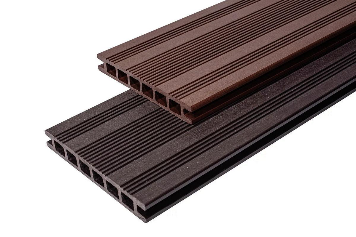 Стильный, надежный, проверенный временем и набравший популярность декинг Ecodeck в популярных цветах для террасы - венге (шоколад) и коричневый.