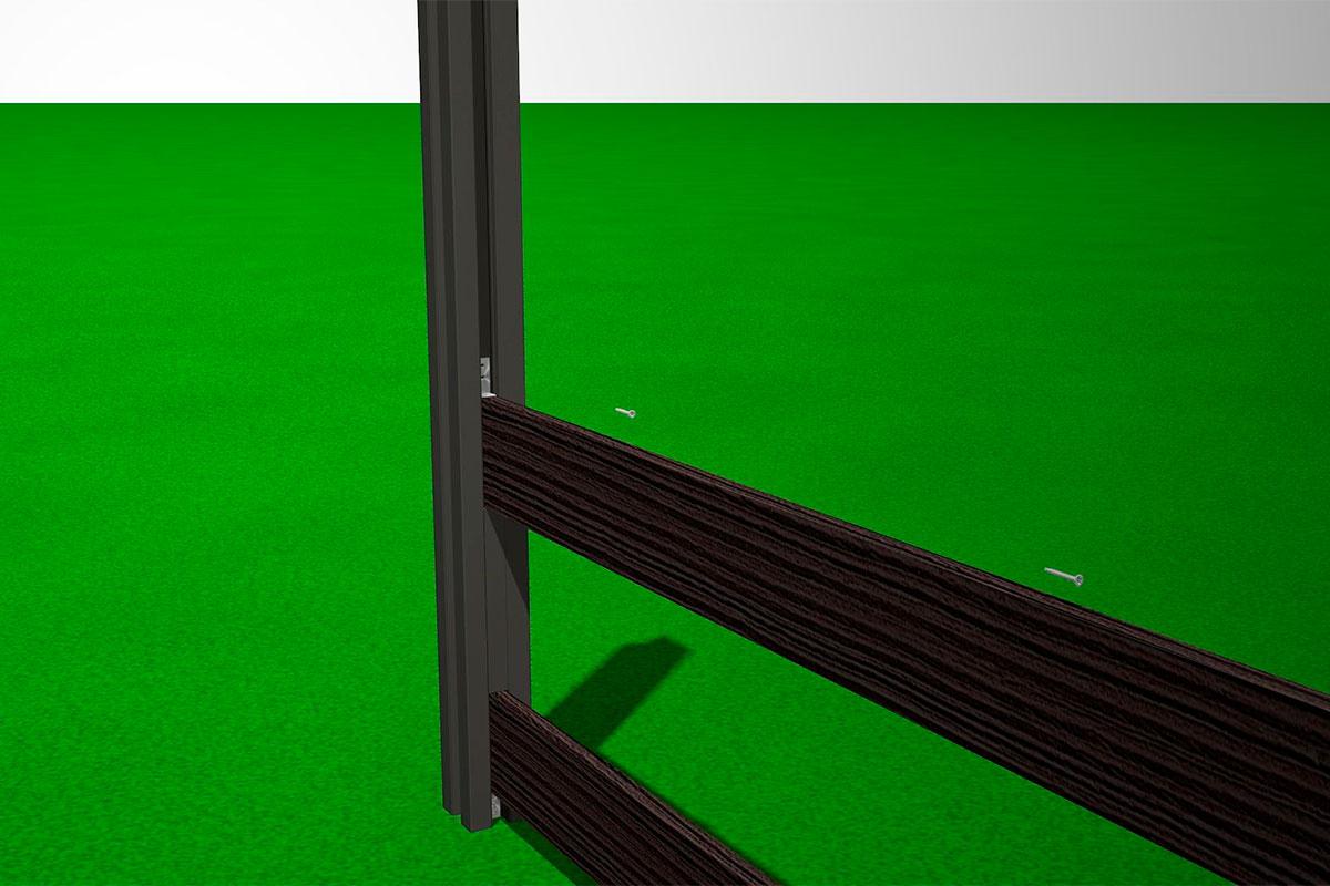 Алюминиевые столбы высокой прочности с ребрами жесткости толщиной 2мм не сгниют.Облегченные, и в то же время прочные, доски из ДПК, позволяют собирать данный тип заборов буквально за считаные минуты.