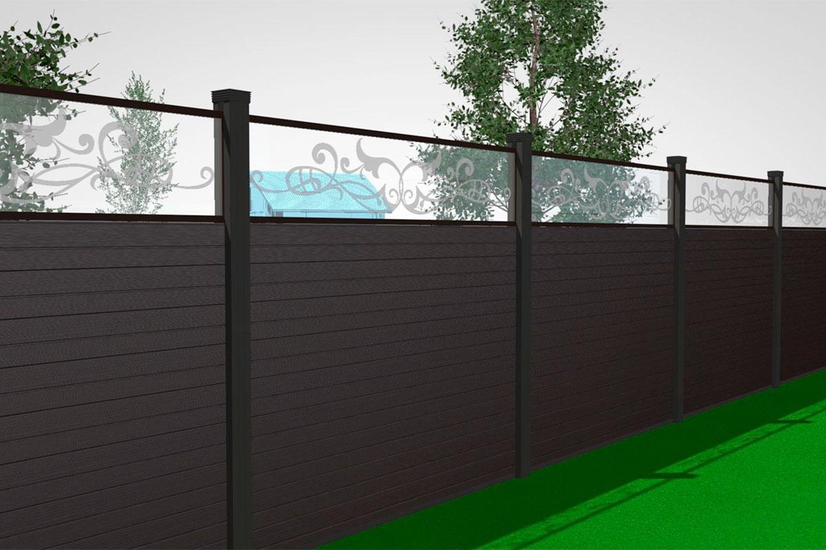 Наименование элемента забора Ед. изм. Кол-во Столб aлюминиевый HILST, 100*100мм м.п. 2 Заглушка для алюминиевого столба HILST, 30*19 мм м.п. 2 П-профиль алюминиевый HILST, 31*30 мм м.п. 4 Профиль алюминиевый для стекла HILST, 25*25мм м.п. 5 Крышка столба окрашенная шт. 1 Уголок 20*20*20*2мм, 50*50*25*2,5мм шт. 4/4 Доска ДПК заборная с тиснением А/Б, шип-паз, 165*25мм м.п. 16 Оргстекло для забора прозрачное, 3050*2050*6мм лист 0,13 Саморезы шт.