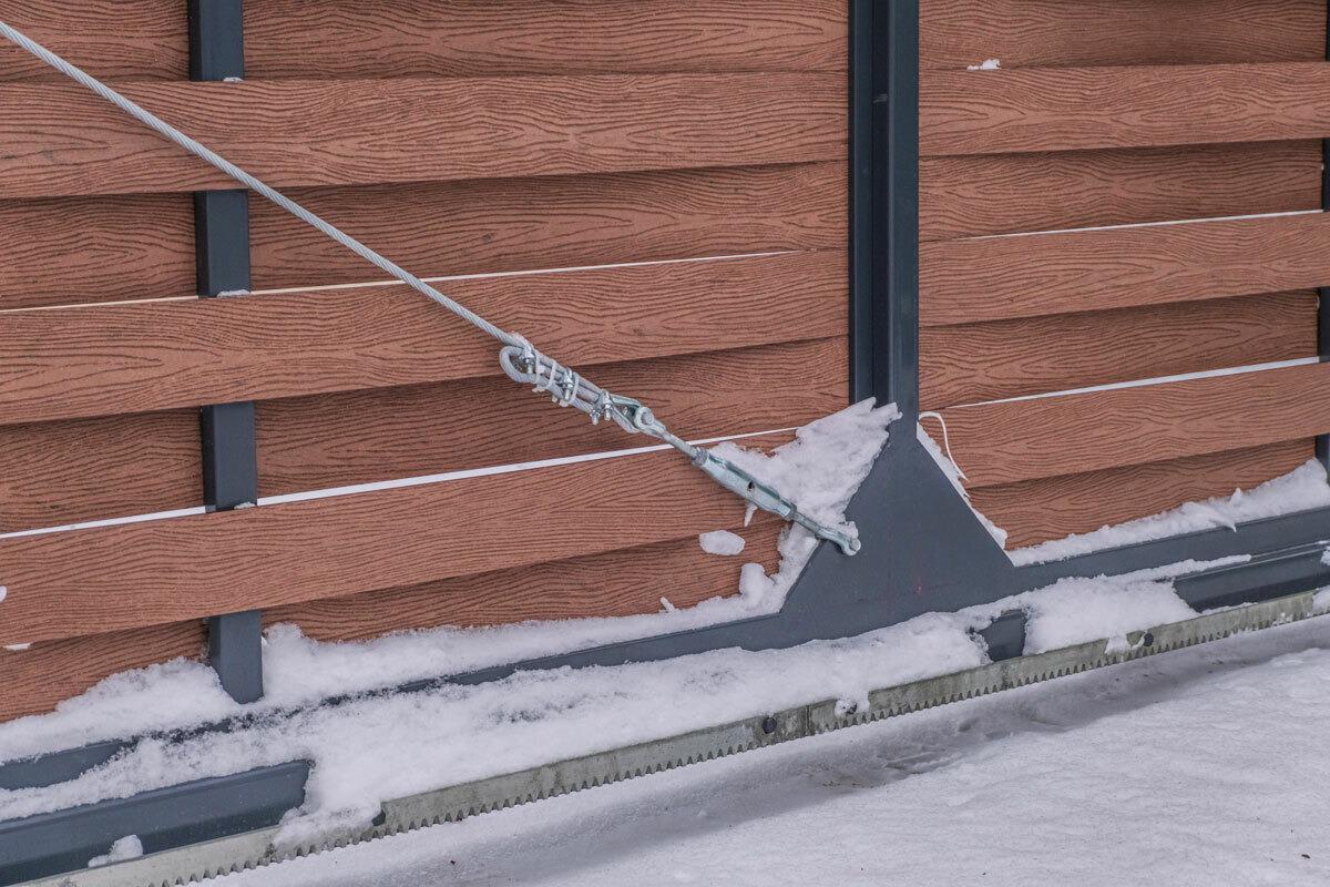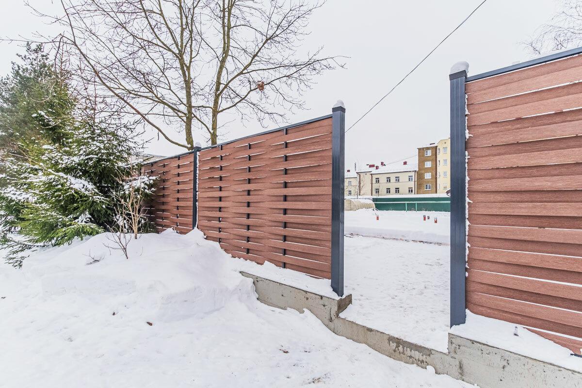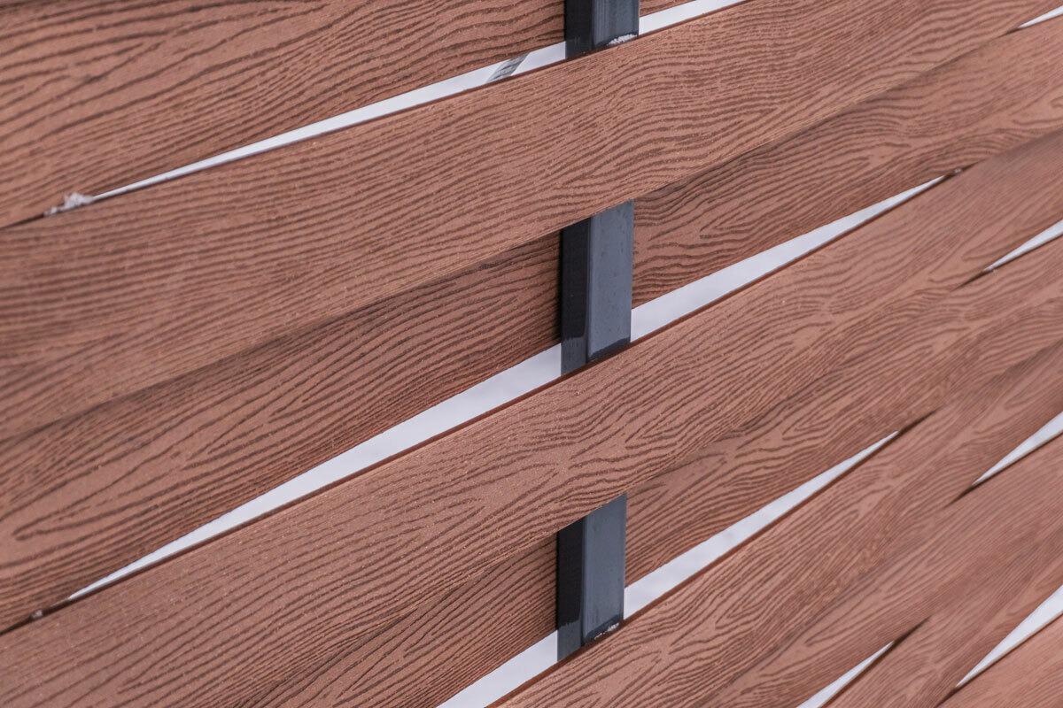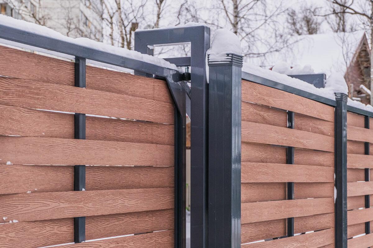 - Крепится штакетник из ДПК к каркасу забора с помощью саморезов.