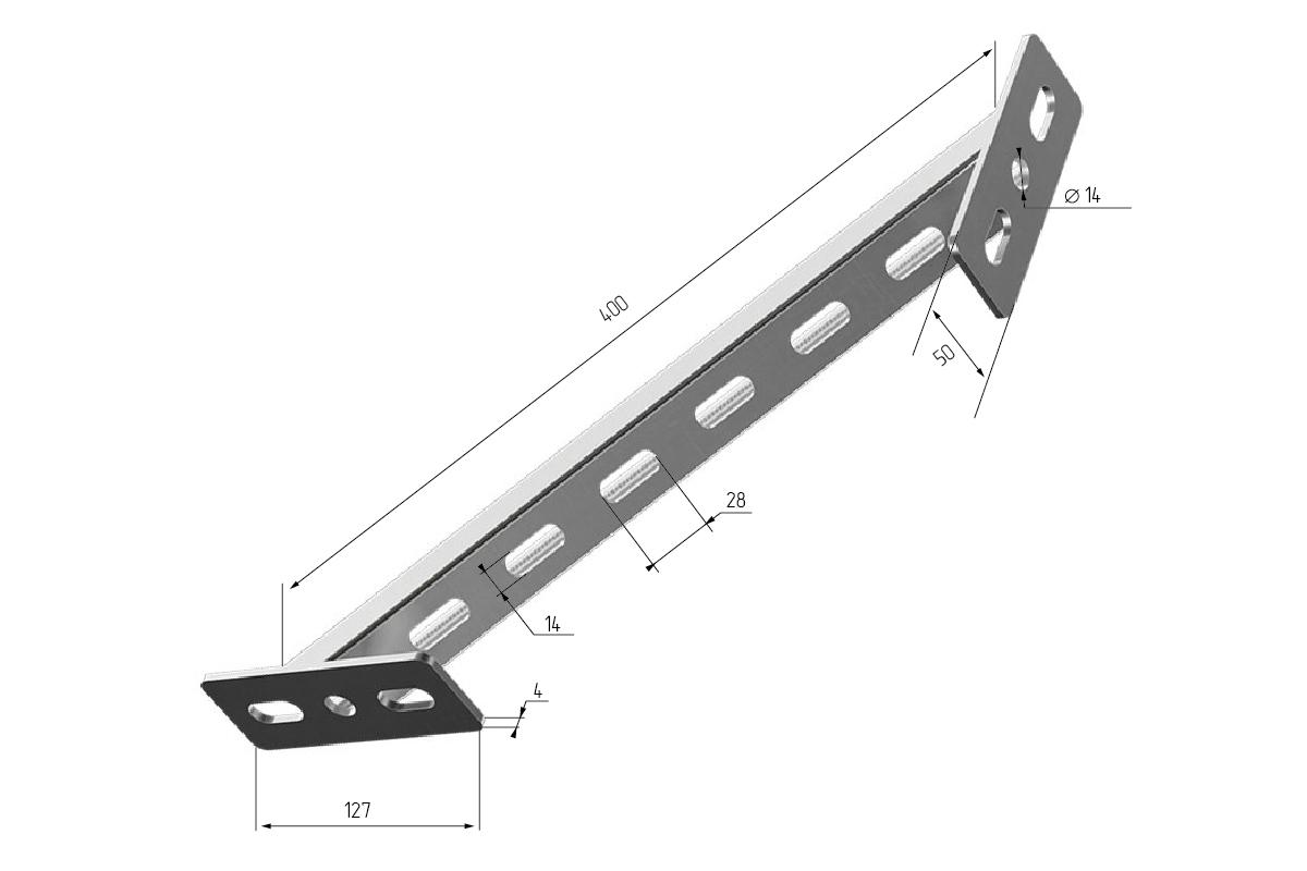 Применяется для усиления настенной консоли, повышения ее жесткости и несущей способности. Изделие служит для поддержки массивных монтажных систем, собранных из металлических профилей. Укосины применяют в конструкциях консольных кронштейнов, эстакад, используемых при трассировке лотков для электрических кабелей, трубопроводных и вентиляционных сетей, прочих систем жизнеобеспечения.