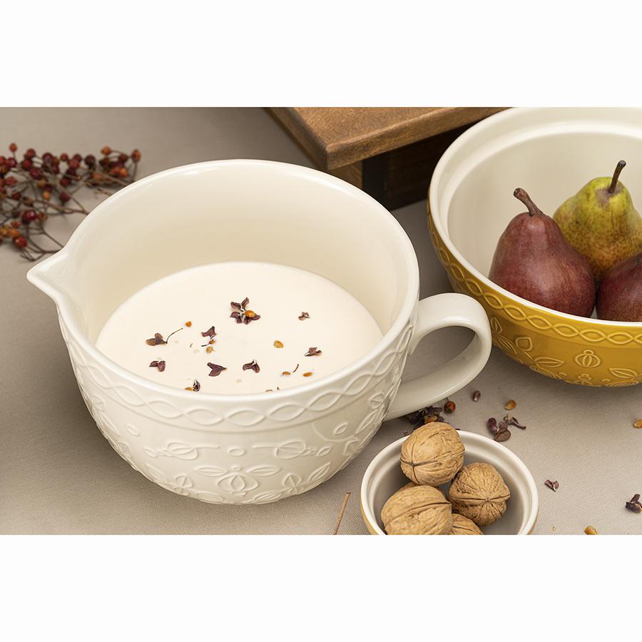Кувшин кремового цвета Ягоды Тайги из коллекции Russian North прекрасно подойдет для смешивания ингредиентов, приготовления соуса, крема для выпечки и десертов. Каменная керамика, из которой выполнена емкость, обладает высокой прочностью и не требует сложного ухода. Глазурованная поверхность с чуть приглушенным глянцем выглядит благородно и вместе с тем очень практична – не царапается и легко отмывается. Рельефный растительный узор в виде стилизованных веточек с ягодами и листьями делает дизайн интересным и запоминающимся. Для взбивания и смешивания рекомендуется использовать венчик с силиконовыми прутьями, силиконовую лопатку или деревянную ложку. Объем: 2 л. ! Можно использовать в микроволновой печи. ! Можно мыть в посудомоечной машине. ! Можно использовать в духовке при температуре не более 160° C. ! Можно замораживать.