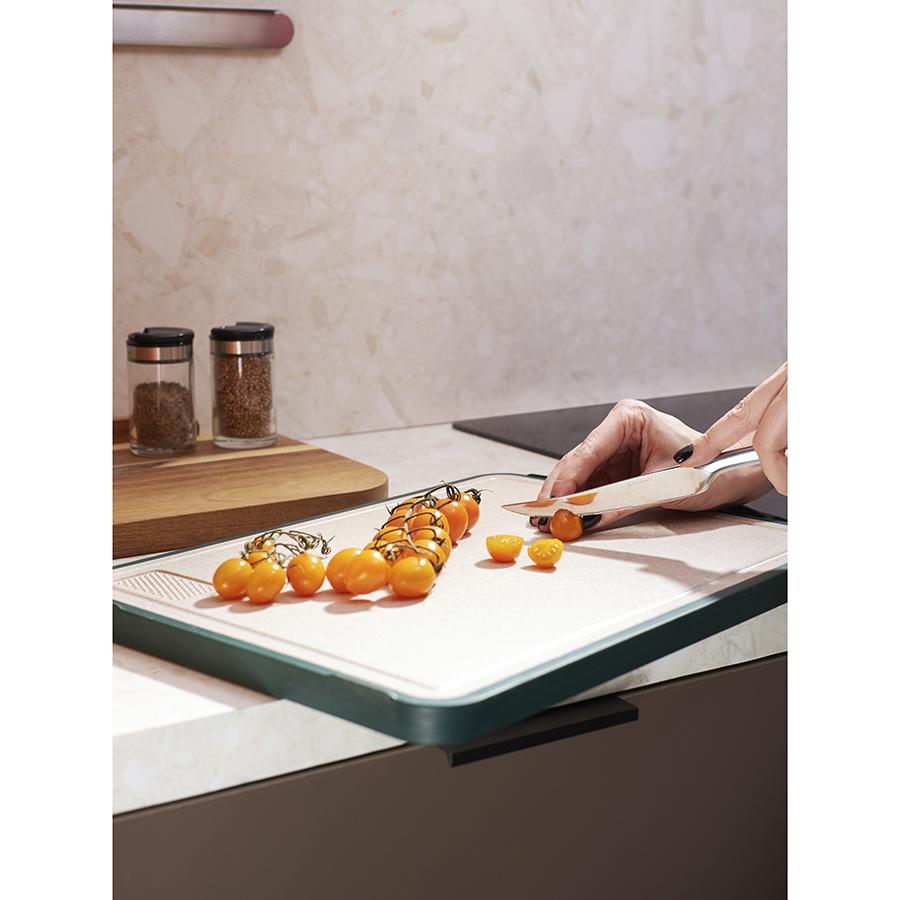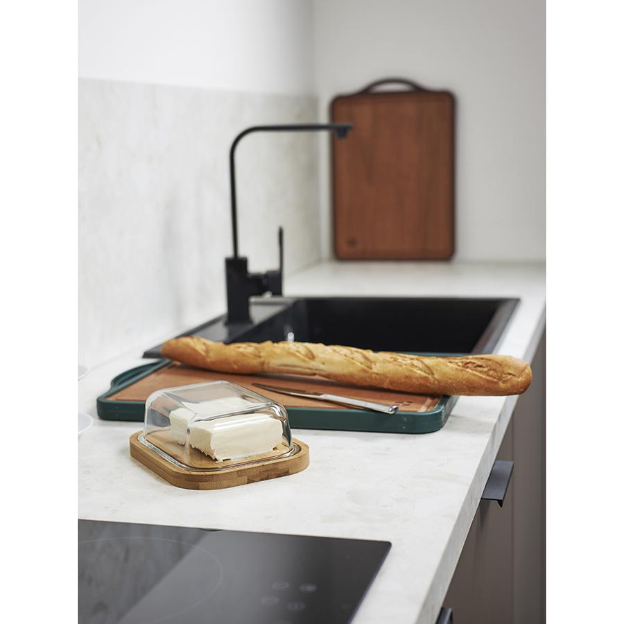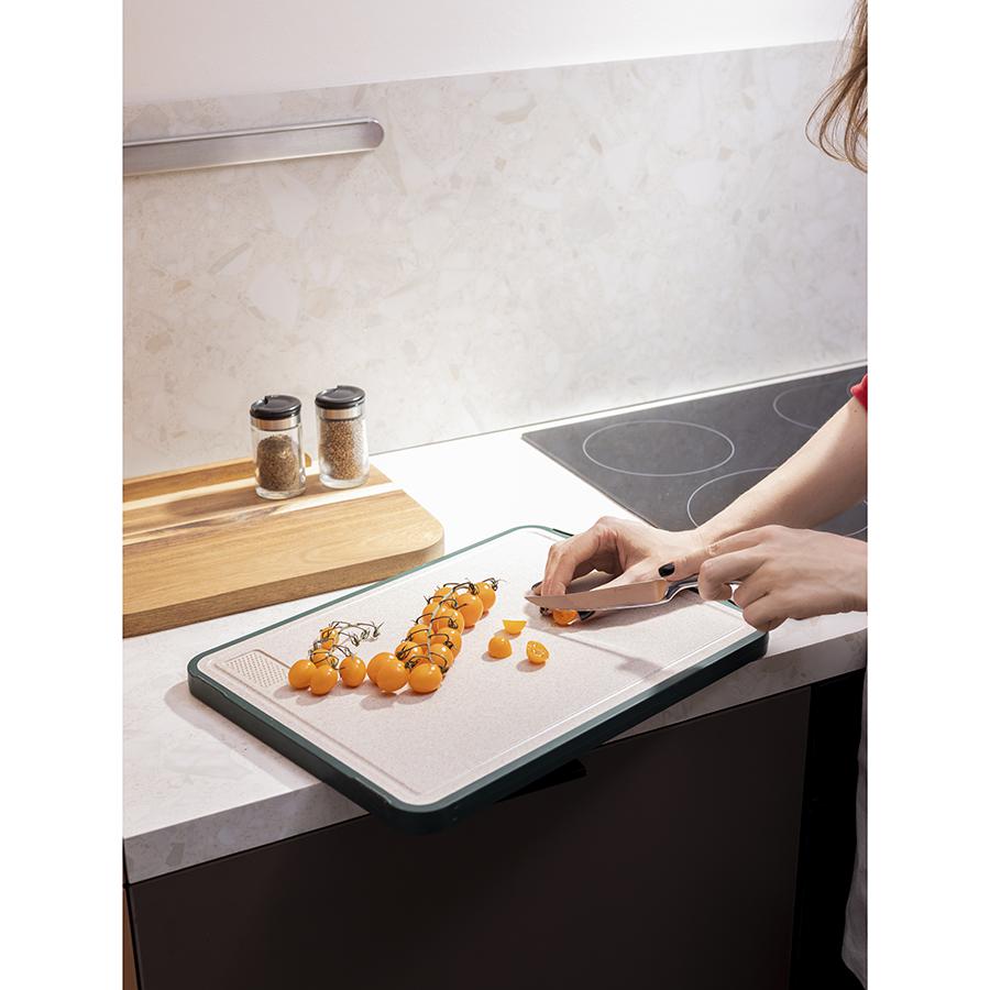 Доска разделочная двухсторонняя Arlett облегчит процесс готовки и станет прекрасным дополнением коллекции стильных и качественных аксессуаров для кухни. Особенности и преимущества: - Сочетание устойчивых к износу пшеничного волокна и черного дерева обеспечивает доске интересный вид, а также практичность и долгий срок службы. - Материалы являются экологичными, не вступают в реакцию с пищей, не меняют вкус и запах продуктов. - Специальные желобки задерживают сок и жидкость, позволяя сохранять порядок на кухне. - Доска легко моется, не скользит во время использования и имеет две рабочие поверхности, благодаря чему идеально подходит для нарезки любых продуктов. - Особенности дизайна дают возможность хранить кухонный аксессуар на стене для экономии полезного пространства. Материалы: пшеничное волокно, черное дерево, резина. Размеры: 44,5х30,5 см. Цвет: темно-зеленый. Рекомендуется очищать от загрязнений в теплой воде при помощи губки с жидким моющим средством. Запрещается мытье в посудомоечной машине.
