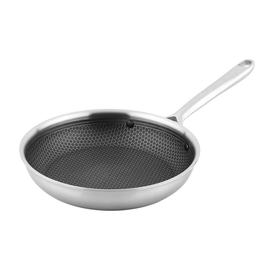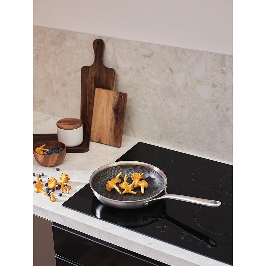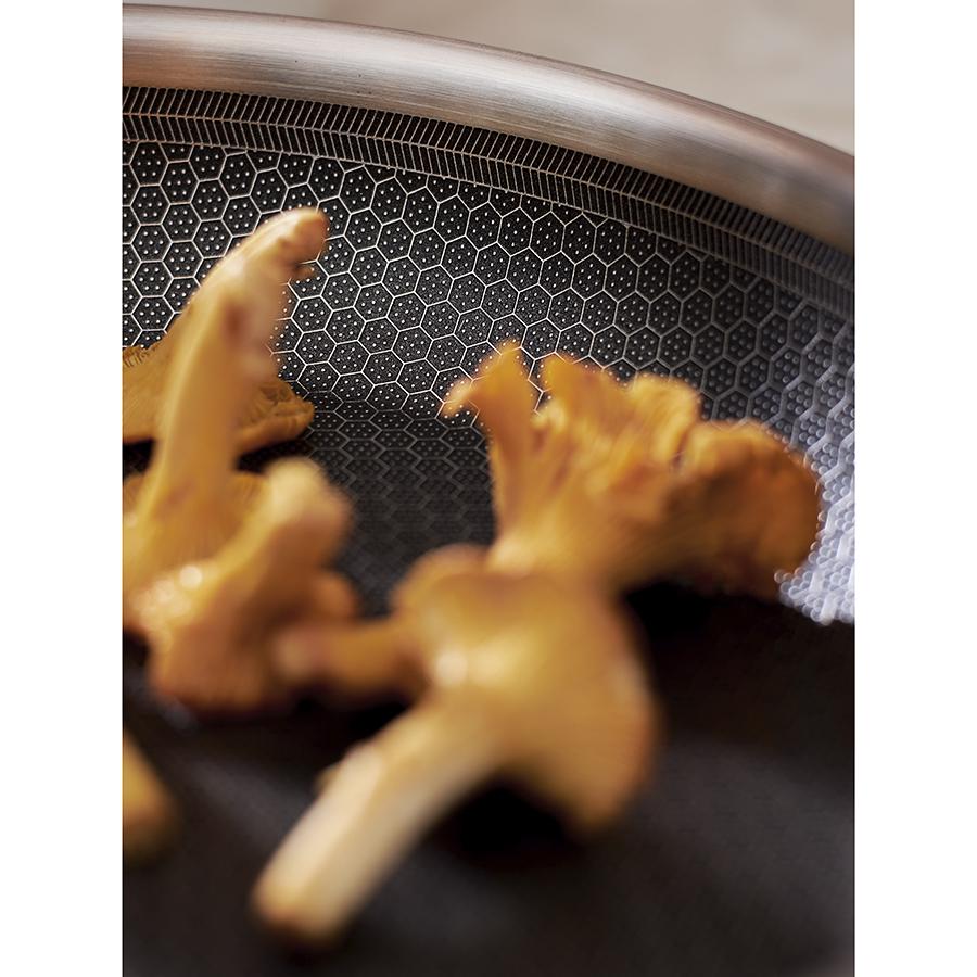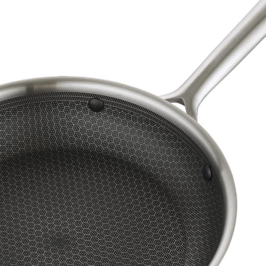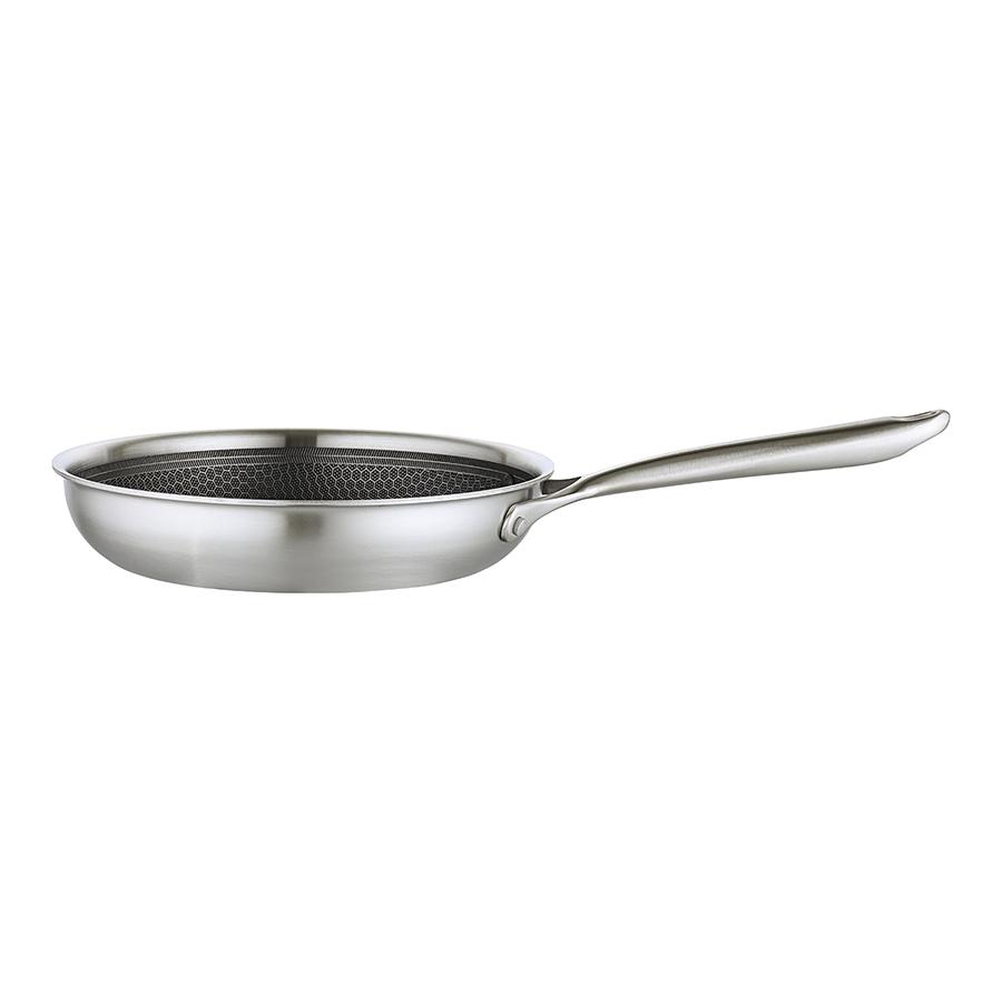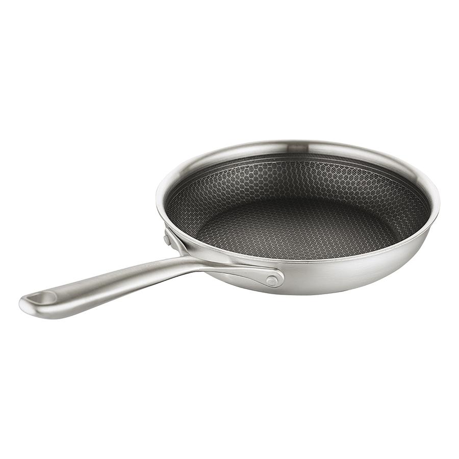 Сковорода 3Ply Etalon, изготовленная по инновационной технологии TRI-PLY, с уникальным структурным дном Honeycomb с лазерным напылением поможет получить настоящее удовольствие от готовки и позволит почувствовать себя настоящим шеф-поваром на собственной кухне. Особенности и преимущества: - Сковорода изготовлена из высококачественной нержавеющей стали 18/10, благодаря чему долго служит, сохраняя первозданный вид. - Дно и стенки из нержавеющей стали толщиной 2,5 мм с внутренним слоем из алюминия обеспечивают равномерное распределение тепла. - Посуда с толстым дном и стенками менее подвержена вмятинам и повреждениям. - Структурное дно Honeycomb с лазерным напылением устойчиво к царапинам и повреждениям, что позволяет использовать металлические кухонные инструменты. - Трехслойное покрытие Теflon Platinum не боится царапин, предотвращает прилипание продуктов, не выделяет вредных веществ и легко моется. - Устойчивая к нагреву ручка гарантирует безопасное и удобное использование. - Сковорода подходит для всех видов плит, включая индукционные, газовые и электрические. - Благодаря матовой поверхности посуда 3Ply Etalon выглядит невероятно стильно, что делает ее украшением любой современной кухни. ! 3Ply Etalon с лазерным напылением по своим антипригарным свойствам отличается от сковородок с традиционным тефлоновым покрытием. Структурное дно Honeycomb предотвращает прилипание, но не полностью защищает от этого, поэтому рекомендуем хорошо разогревать сковороду перед жаркой и обязательно использовать небольшое количество масла. Некоторые “капризные” продукты, например, яичница, могут первое время требовать чуть больше внимания и контроля температуры. Зато блюда, приготовленные на этой сковороде, приобретают хрустящую корочку, которую сложнее получить на обычной антипригарной поверхности. Материал: нержавеющая сталь, алюминий, антипригарное покрытие Теflon Platinum. Диаметр по краю внешний: 25,6 см. Диаметр по краю внутренний: 24 см. Ширина: 25,5 см. Длина: 45,9 см. Высота: 5 см. Диаметр дна снаружи: 19 см. Диаметр дна изнутри: 19 см. Высота стенки изнутри: 5,5 см. Сковороду запрещено мыть в посудомоечной машине, только вручную. Перед первым использованием необходимо промыть сковороду в теплой мыльной воде при помощи мягкой губки. В дальнейшем рекомендуется очищать посуду сразу после приготовления, как только она остынет. Запрещается использование абразивов и агрессивной бытовой химии.