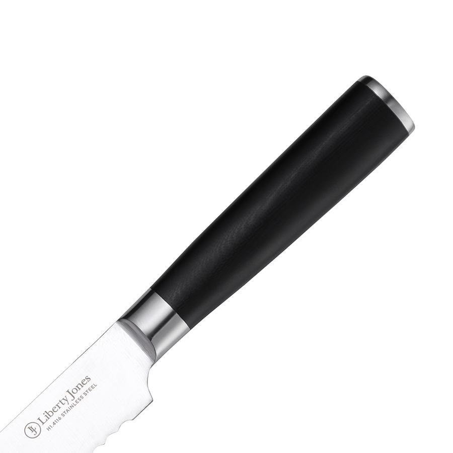 Нож Icon от бренда Liberty Jones идеально подходит для аккуратного нарезания любых видов хлеба, от хрустящих багетов до мягких булочек. Клинок из известной своими свойствами немецкой нержавеющей стали гарантирует кухонному инструменту долговечность и безупречную остроту, а ручка из композитного материала обеспечивает комфорт и безопасность в использовании. Лазерные системы контролируют угол заточки с точностью до 0,1°, что невозможно при ручной или механической обработке. Кроме того, лазерная заточка не перегревает металл (в отличие от ручных методов), сохраняя структуру стали. Особенности и преимущества: - Рукоятка инструмента выполнена из ударопрочного, влагостойкого материала G-10, имеет эргономичную форму, обеспечивая надежный хват. - Лезвие из немецкой нержавеющей стали 1.4116 обладает высокой твердостью и устойчивостью к коррозии. - В производстве используется технология лазерной заточки, что обеспечивает лезвию идеальную геометрию, максимальную остроту и исключает необходимость частой заточки. - Зазубренное лезвие аккуратно прорезает корку, не сжимая и не деформируя мякиш, что позволяет получать ровные и аккуратные ломтики. - Современный, лаконичный дизайн делает нож Icon не только функциональным инструментом, но и украшением любой кухни. Материал: немецкая нержавеющая сталь 1.4116, композитный материал из стекловолокна G-10. Размеры: 3х33,1х2,4 см. Толщина лезвия: 0,2 мм. Длина клинка: 20,6 см. Угол заточки: 15-17°. Нож рекомендуется мыть вручную. Запрещается использование абразивных материалов и агрессивной бытовой химии.