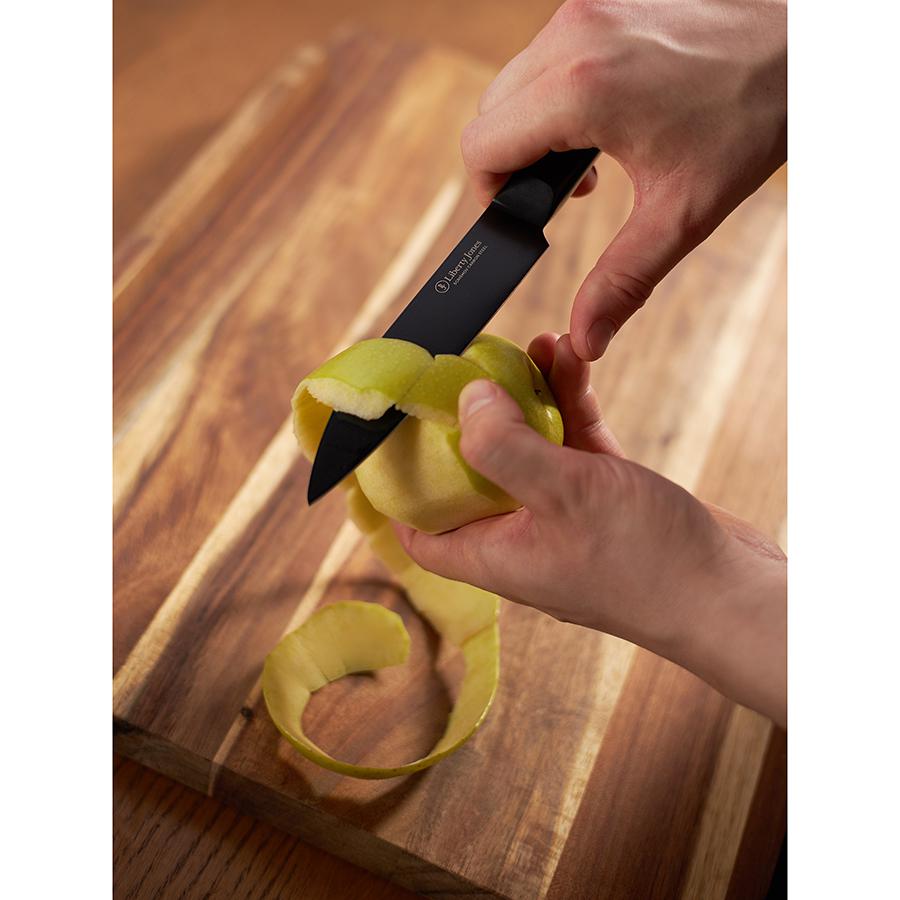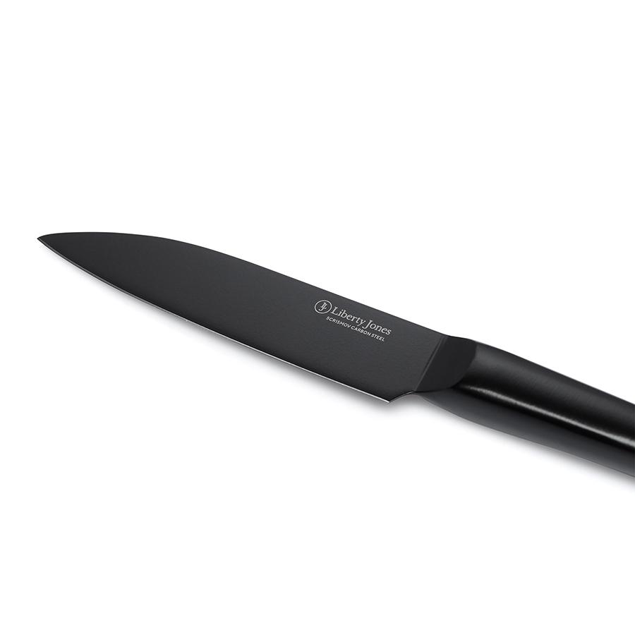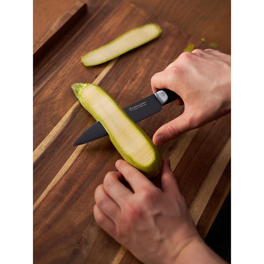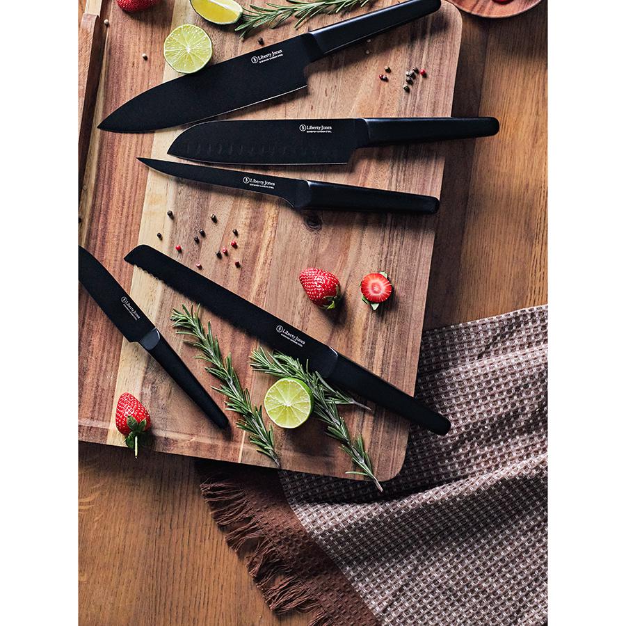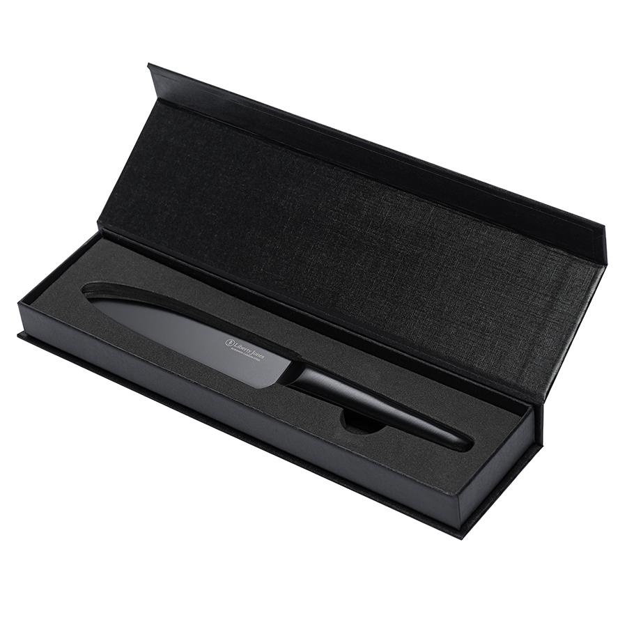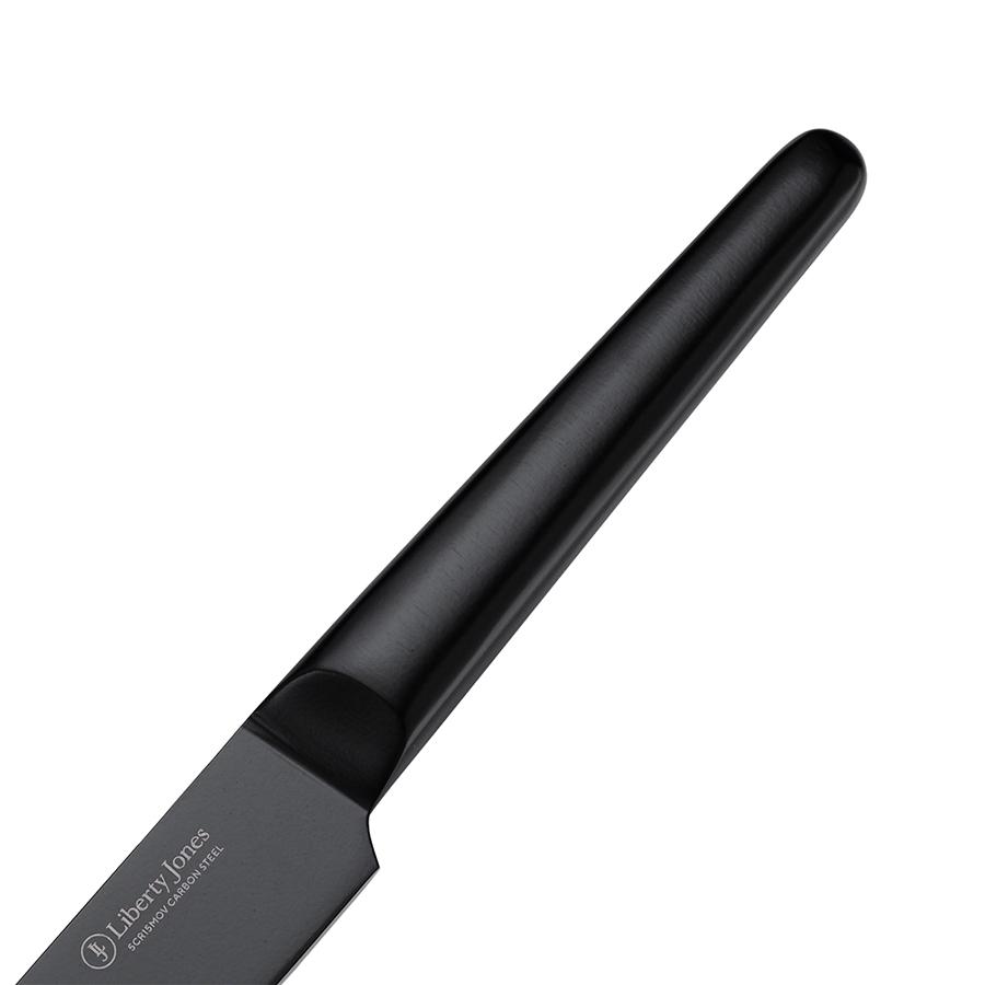 Разделочный нож Carbon от бренда Liberty Jones – многофункциональный кухонный инструмент, созданный для истинных ценителей качества и функциональности. Он идеально подходит для нарезки мяса, рыбы, овощей и фруктов. Благодаря прочной конструкции из углеродистой стали и эргономичному дизайну, этот нож станет надежным помощником на кухне, сделав каждую готовку легкой и приятной. Особенности и преимущества: - Нож представляет собой цельную конструкцию, где лезвие плавно переходит в рукоятку. Это обеспечивает ему практичность и долговечность, исключая риск поломки в местах соединения. - Лезвие и рукоятка изготовлены из углеродистой стали 5Cr15Mov, известной своей прочностью, устойчивостью к высоким нагрузкам и коррозии. - В производстве используется технология лазерной заточки, что обеспечивает лезвию идеальную геометрию, максимальную остроту и исключает необходимость частой заточки. - Рукоятка кухонного инструмента имеет удобную форму и обеспечивает надежный хват, снижая риск порезов. - Покрытие черного цвета придает ножу современный и стильный вид. - При заточке ножа эмаль на лезвии незначительно стирается, что приводит к проявлению исходного цвета стали. Материал: углеродистая сталь 5Cr15Mov. Размеры: 2,8х24,3х1,8 см. Толщина лезвия: 0,2 мм. Длина клинка: 13,2 см. Угол заточки: 15-17°. Нож рекомендуется мыть вручную. Запрещается использование абразивных материалов и агрессивной бытовой химии.