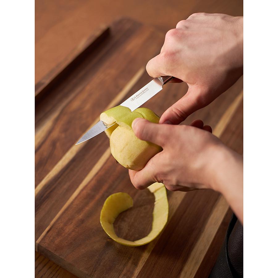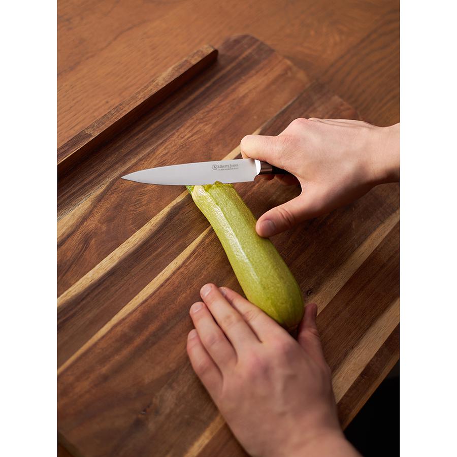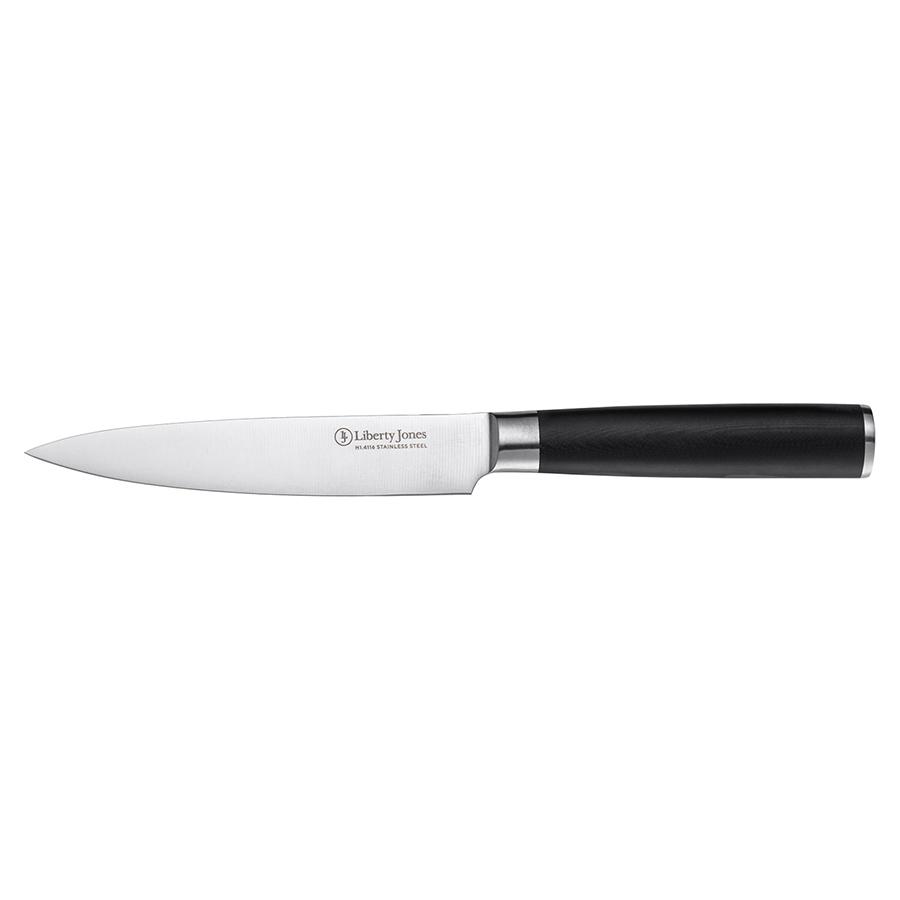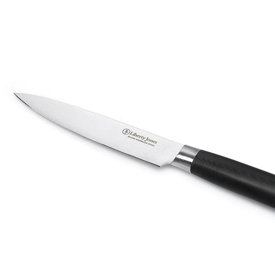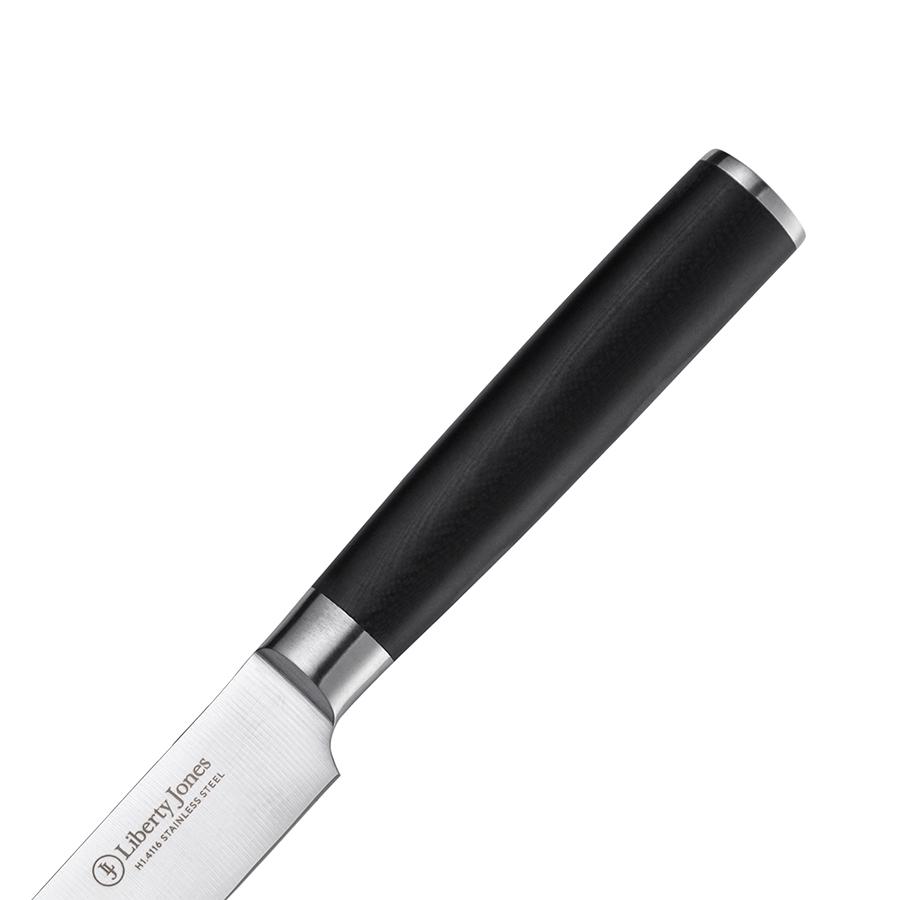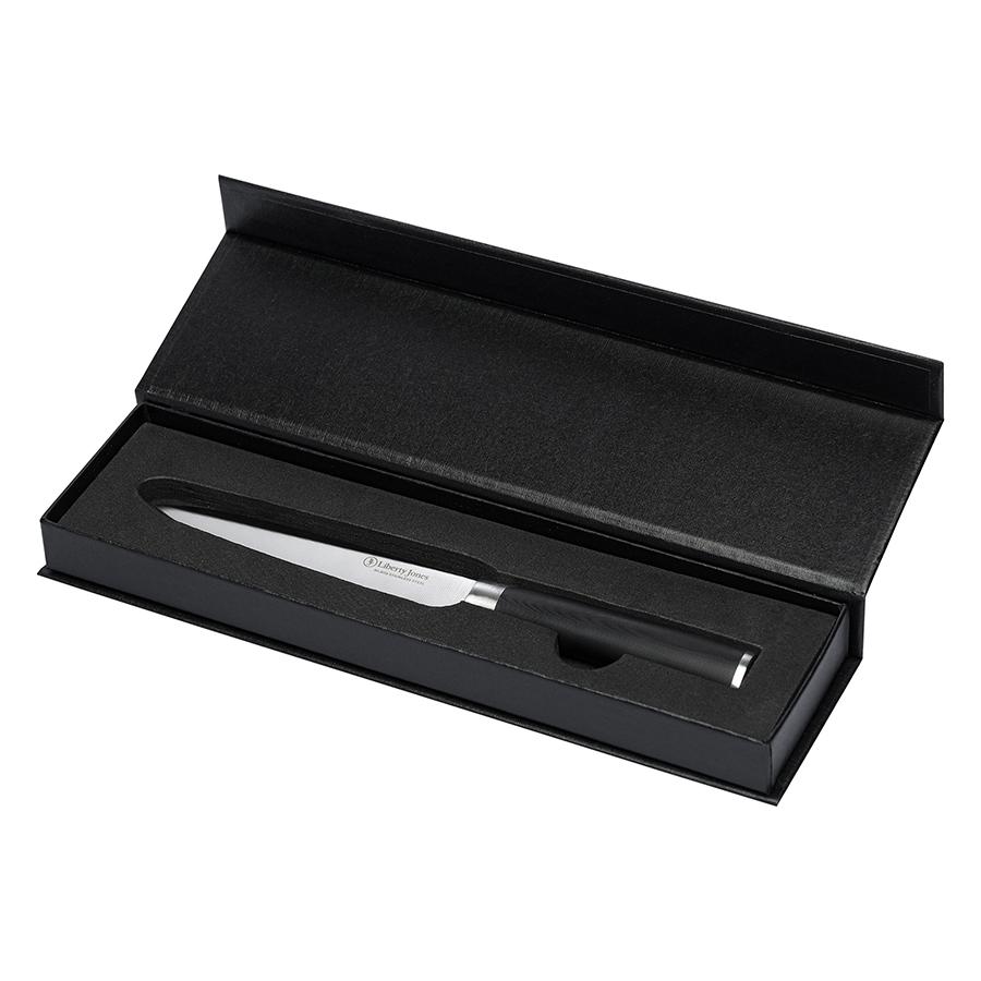 Разделочный нож Icon от бренда Liberty Jones – многофункциональный кухонный инструмент из немецкой нержавеющей стали, созданный для истинных ценителей качества и функциональности. Он идеально подходит для нарезки мяса, рыбы, овощей и фруктов, обеспечивая надежность и удобство использования. Лазерные системы контролируют угол заточки с точностью до 0,1°, что невозможно при ручной или механической обработке. Кроме того, лазерная заточка не перегревает металл (в отличие от ручных методов), сохраняя структуру стали. Особенности и преимущества: - Рукоятка инструмента выполнена из ударопрочного, влагостойкого материала G-10, имеет эргономичную форму, обеспечивая надежный хват. - Лезвие из немецкой нержавеющей стали 1.4116 обладает высокой твердостью и устойчивостью к коррозии. - В производстве используется технология лазерной заточки, что обеспечивает лезвию идеальную геометрию, максимальную остроту и исключает необходимость частой заточки. - Лаконичный, современный дизайн делает нож Icon не только функциональным инструментом, но и украшением любой кухни. Материал: немецкая нержавеющая сталь 1.4116, композитный материал из стекловолокна G-10. Размеры: 2,8х24,3х1,8 см. Толщина лезвия: 0,3 мм. Длина клинка: 12,6 см. Угол заточки: 15-17°. Нож рекомендуется мыть вручную. Запрещается использование абразивных материалов и агрессивной бытовой химии.