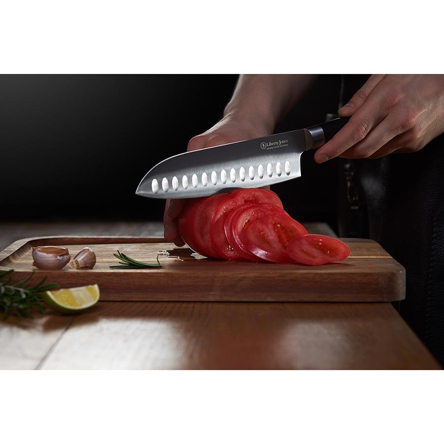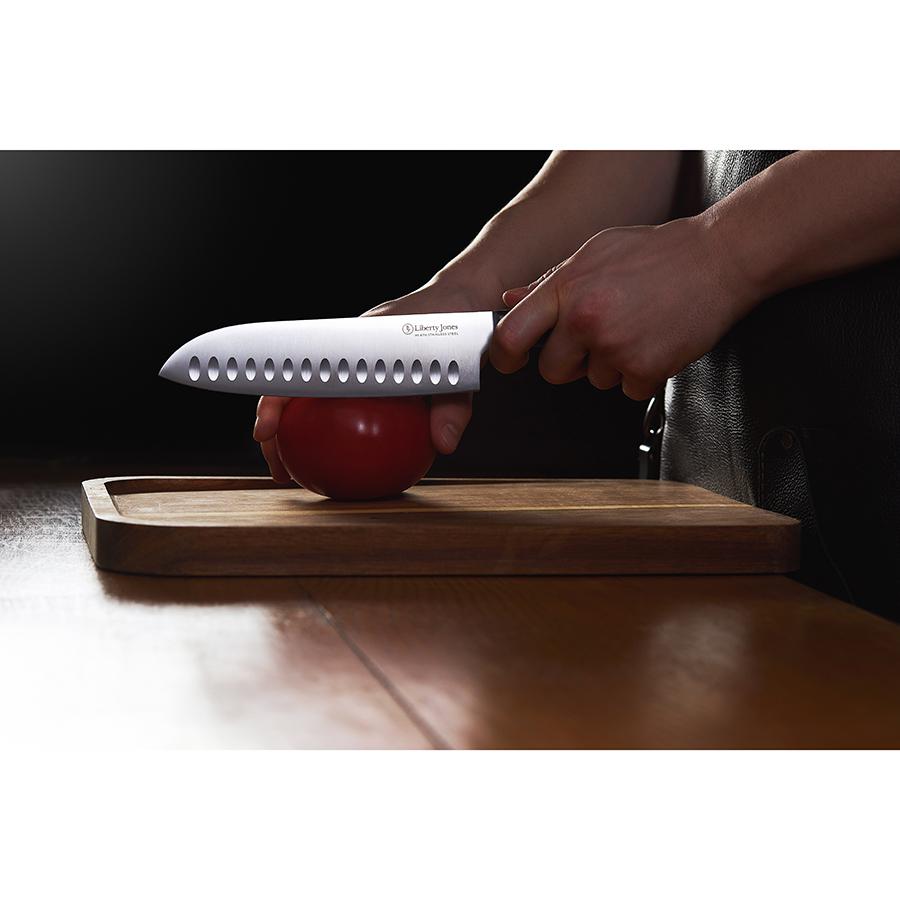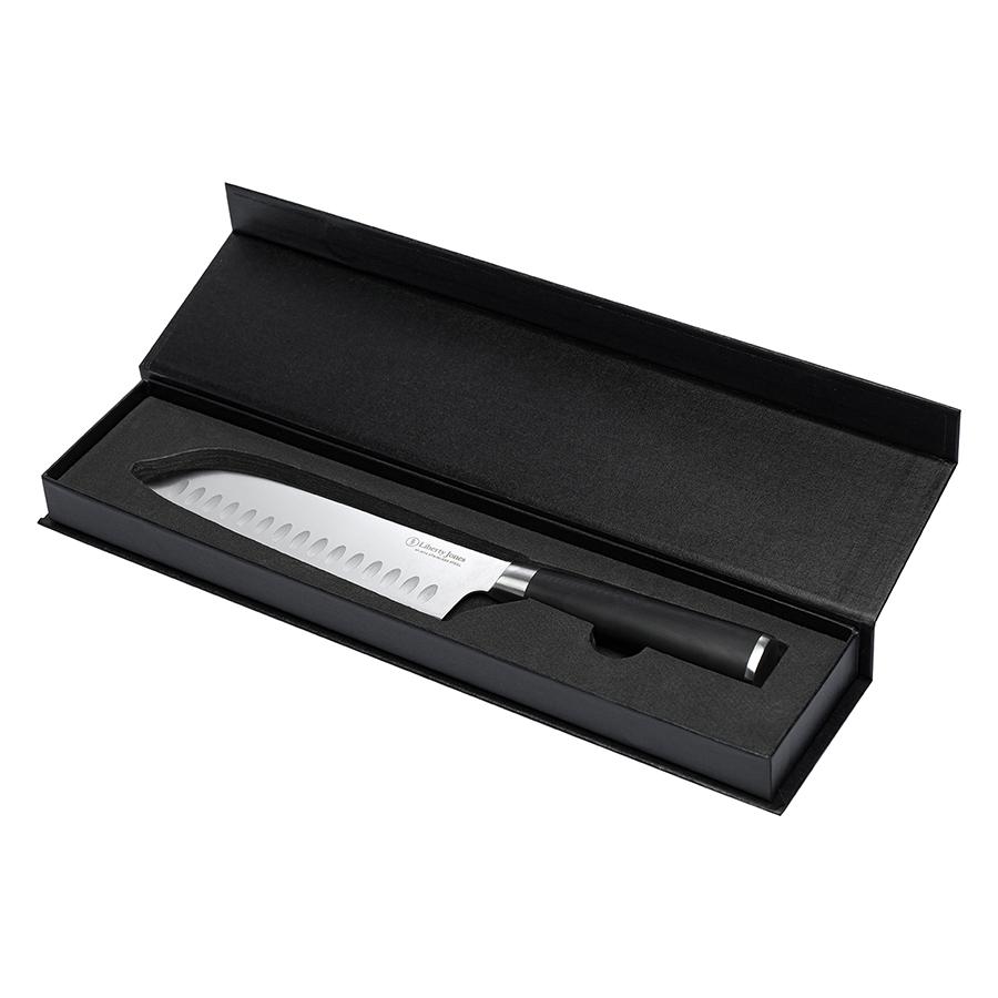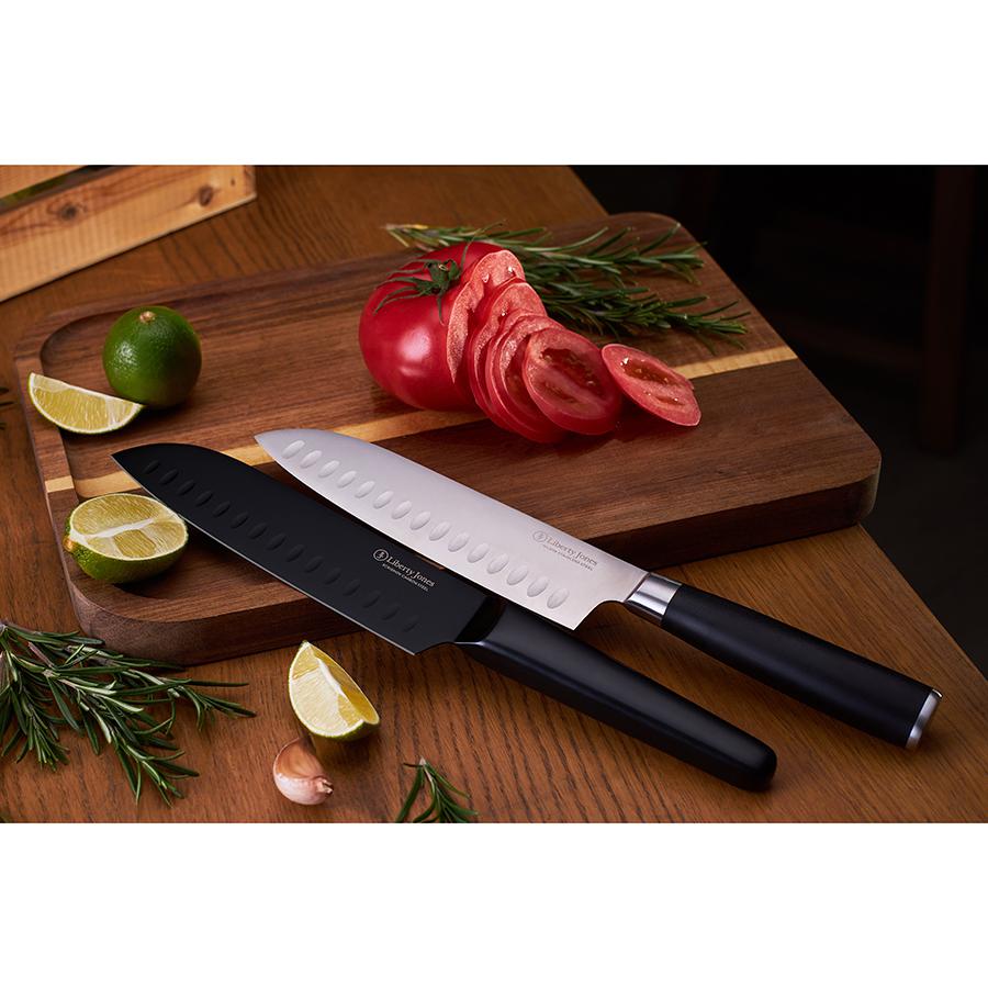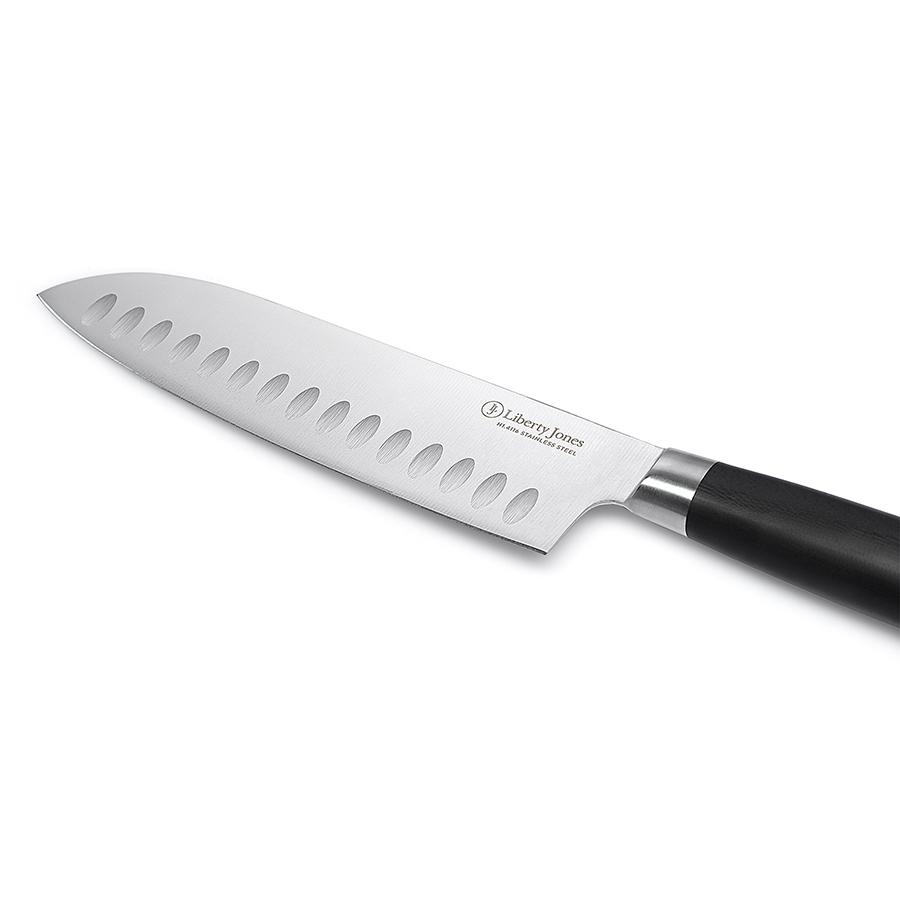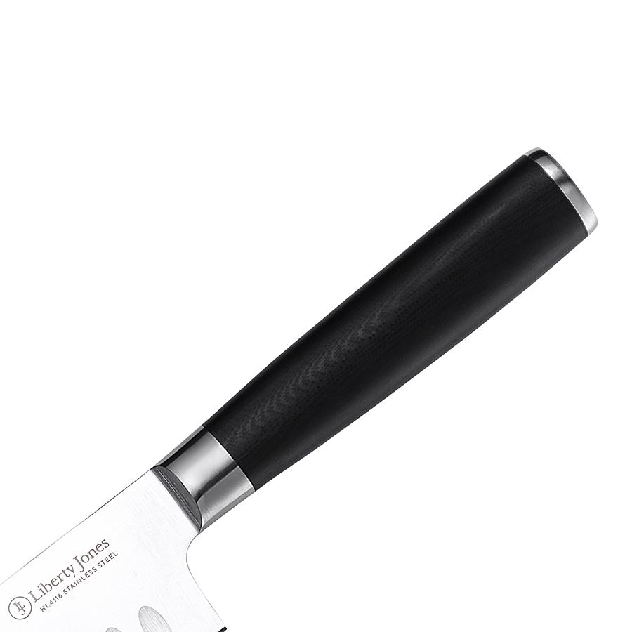 Нож Сантоку Icon от бренда Liberty Jones – идеальный выбор не только для опытных поваров, но и для любителей кулинарии, желающих достичь высоких результатов на кухне. Этот универсальный инструмент из известной своими свойствами немецкой нержавеющей стали идеально подходит для нарезки, рубки, шинковки и измельчения продуктов, обеспечивая комфорт при каждом использовании. Лазерные системы контролируют угол заточки с точностью до 0,1°, что невозможно при ручной или механической обработке. Кроме того, лазерная заточка не перегревает металл (в отличие от ручных методов), сохраняя структуру стали. Особенности и преимущества: - Рукоятка инструмента выполнена из ударопрочного, влагостойкого материала G-10, имеет эргономичную форму, обеспечивая надежный хват. - Лезвие из немецкой нержавеющей стали 1.4116 обладает высокой твердостью и устойчивостью к коррозии. - В производстве используется технология лазерной заточки, что обеспечивает лезвию идеальную геометрию, максимальную остроту и исключает необходимость частой заточки. - Лаконичный, современный дизайн делает нож Icon не только функциональным инструментом, но и украшением любой кухни. Материал: немецкая нержавеющая сталь 1.4116, композитный материал из стекловолокна G-10. Размеры: 4,6х30,8х2,3 см. Толщина лезвия: 0,3 мм. Длина клинка: 18,4 см. Угол заточки: 15-17°. Нож рекомендуется мыть вручную. Запрещается использование абразивных материалов и агрессивной бытовой химии.