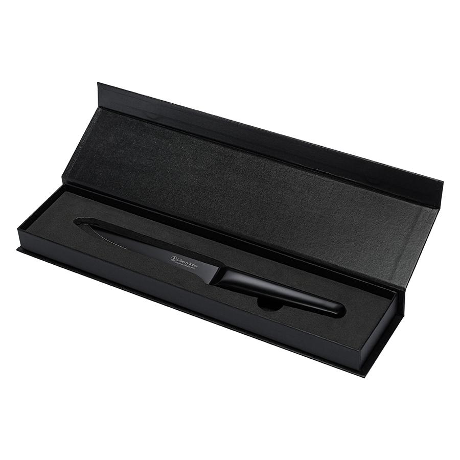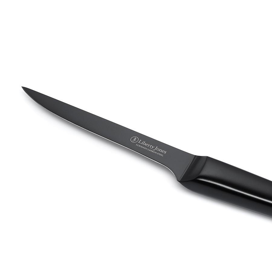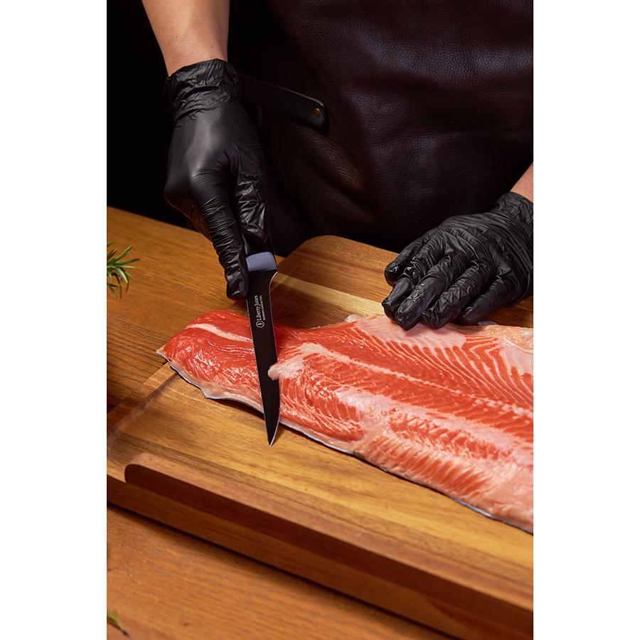 Нож филейный Carbon от бренда Liberty Jones – идеальный инструмент для разделки рыбы, мяса и птицы. Он легко справляется с такими задачами, как удаление кожи, отделение филе от костей и нарезка тонких ломтиков. Его лезвие из углеродистой стали обеспечивает легкость и точность каждого движения, делая процесс приготовления пищи быстрым и приятным. Особенности и преимущества: - Нож представляет собой цельную конструкцию, где лезвие плавно переходит в рукоятку. Это обеспечивает ему практичность и долговечность, исключая риск поломки в местах соединения. - Лезвие и рукоятка изготовлены из углеродистой стали 5Cr15Mov, известной своей прочностью, устойчивостью к высоким нагрузкам и коррозии. - В производстве используется технология лазерной заточки, что обеспечивает лезвию идеальную геометрию, максимальную остроту и исключает необходимость частой заточки. - Рукоятка кухонного инструмента имеет удобную форму и обеспечивает надежный хват, снижая риск порезов. - Покрытие черного цвета придает ножу современный и стильный вид. - При заточке ножа эмаль на лезвии незначительно стирается, что приводит к проявлению исходного цвета стали. Материал: углеродистая сталь 5Cr15Mov. Размеры: 1,9х28,5х2,8 см. Толщина лезвия: 0,2 мм. Длина клинка: 15,3 см. Угол заточки: 15-17°. Нож рекомендуется мыть вручную. Запрещается использование абразивных материалов и агрессивной бытовой химии.