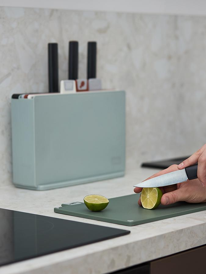 Набор Cut ножи – нержавеющая сталь 3CR13, полипропилен; держатель – ABS-пластик. Размеры: доски – 30х22,8х0,7 см; держатель – 30,5х10,7х20,8 см; поварской нож – 30х4,2 см, толщина стали – 2 мм; нож для хлеба – 30х2,7 см, толщина стали – 2 мм; нож для нарезки – 28,7х3,5 см, толщина стали – 2 мм; нож для очистки овощей – 22,5х2,6 см, толщина стали – 1,5 мм. Количество предметов в наборе: 9 шт. Ножи и разделочные доски можно мыть в посудомоечной машине.