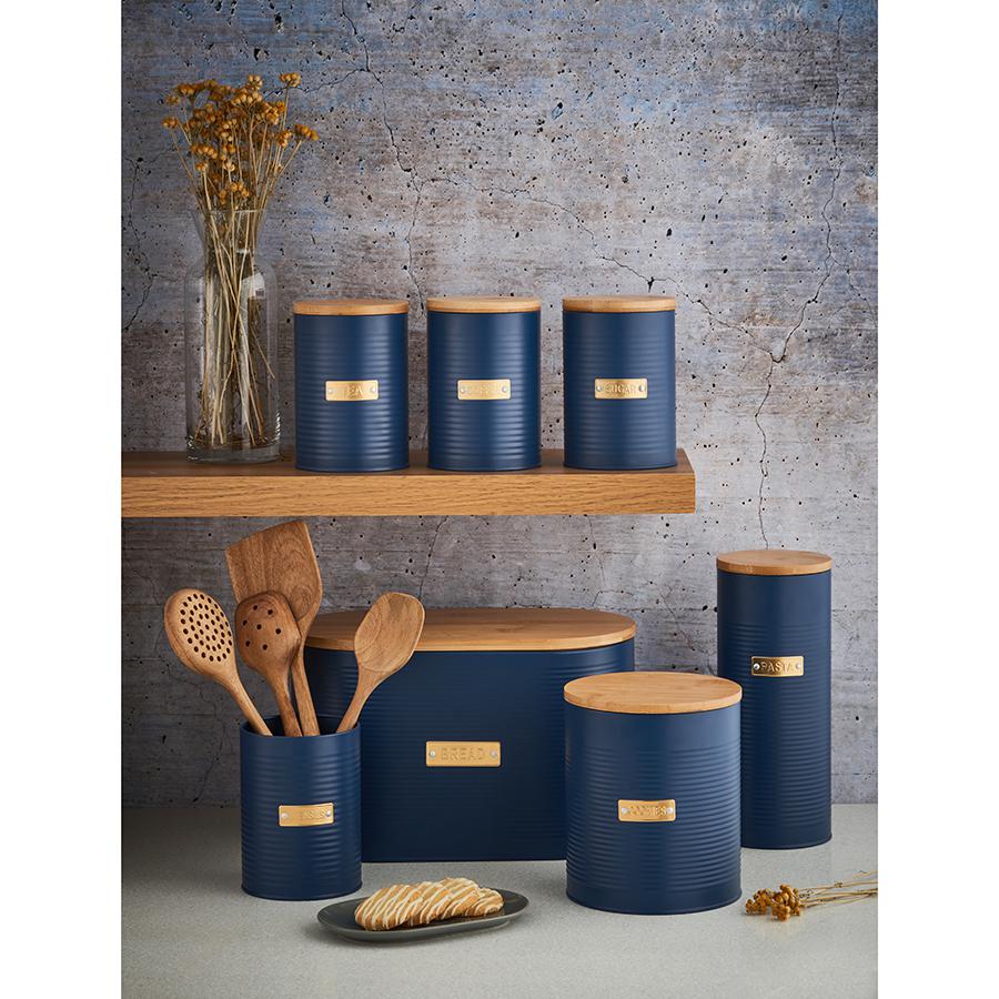 Банка для пасты из коллекции Otto – удобное решение для хранения сыпучих продуктов и стильный элемент кухонного интерьера. Эргономичный контейнер выполнен из прочной, устойчивой к коррозии и деформации углеродистой стали. Плотно прилегающая бамбуковая крышка с силиконовым уплотнителем защищает содержимое банки от заветривания и отсыревания. Рельефная поверхность и красивое сочетание золотистого декора с матовым покрытием насыщенного синего цвета делает дизайн интересным. Такая посуда отлично вписывается в интерьер, оформленный в классическом и современном стиле. Материалы: углеродистая сталь, бамбук, силикон. Объем: 2 л. Цвет: синий. Перед первым использованием емкость рекомендуется хорошо вымыть вручную в теплой воде с мягким моющим средством. Запрещается применение абразивных материалов и агрессивной бытовой химии.