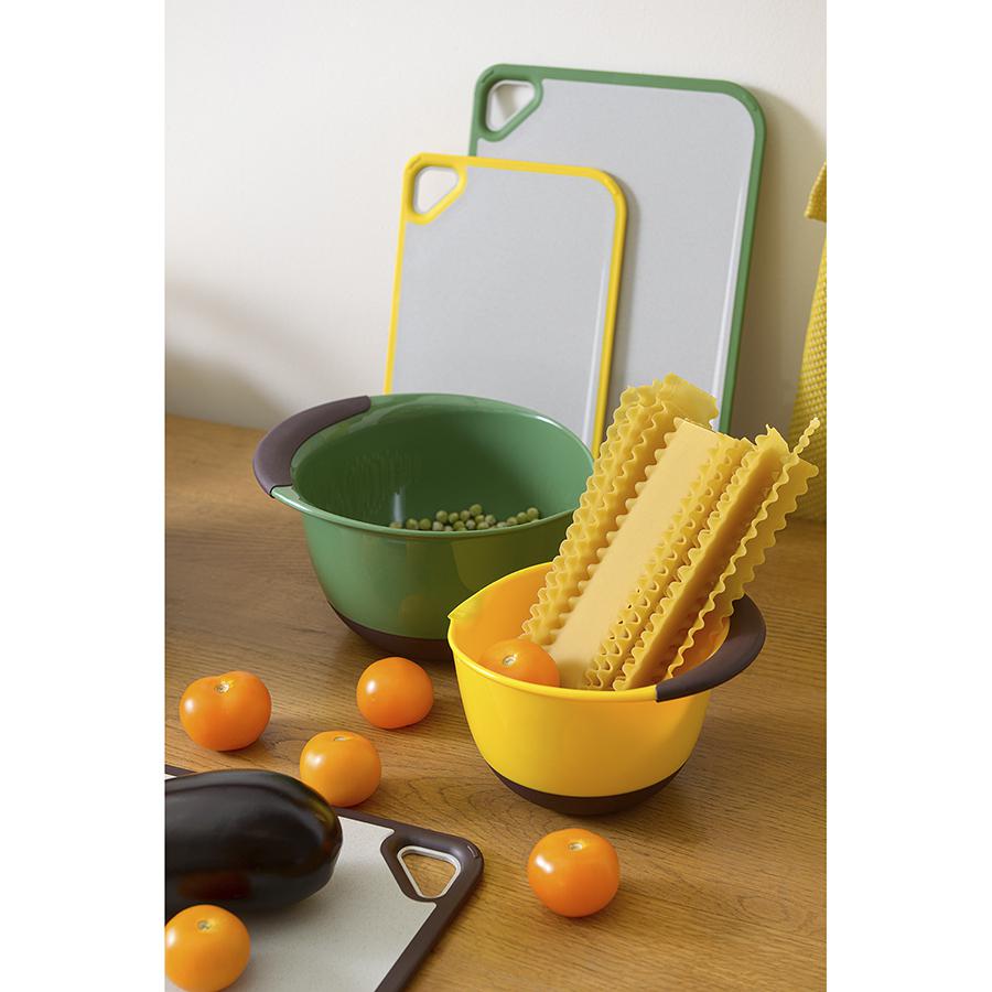 Доска разделочная Homi из пшеничного волокна – идеальное сочетание экологичности, практичности и стильного дизайна. Она станет верным помощником в кулинарных экспериментах и позволит наслаждаться процессом готовки. Особенности и преимущества: - Материал является экологичным, не содержит BPA, не трескается, не деформируется, не впитывает запахи и загрязнения, не тупит лезвия ножей. - Доска легко моется и не скользит по столу во время использования благодаря окантовке из прорезиненного материала. - Небольшой желобок, расположенный по краю, задерживает жидкость, обеспечивая чистоту на рабочей поверхности. - Доска имеет специальное отверстие для удобного хранения на подвесных держателях. Материалы: пшеничное волокно, полипропилен, термопластичный эластомер. Размеры: 29х20х0,75 см. Цвет: светло-серый с желтым кантом. Доску можно мыть в посудомоечной машине.