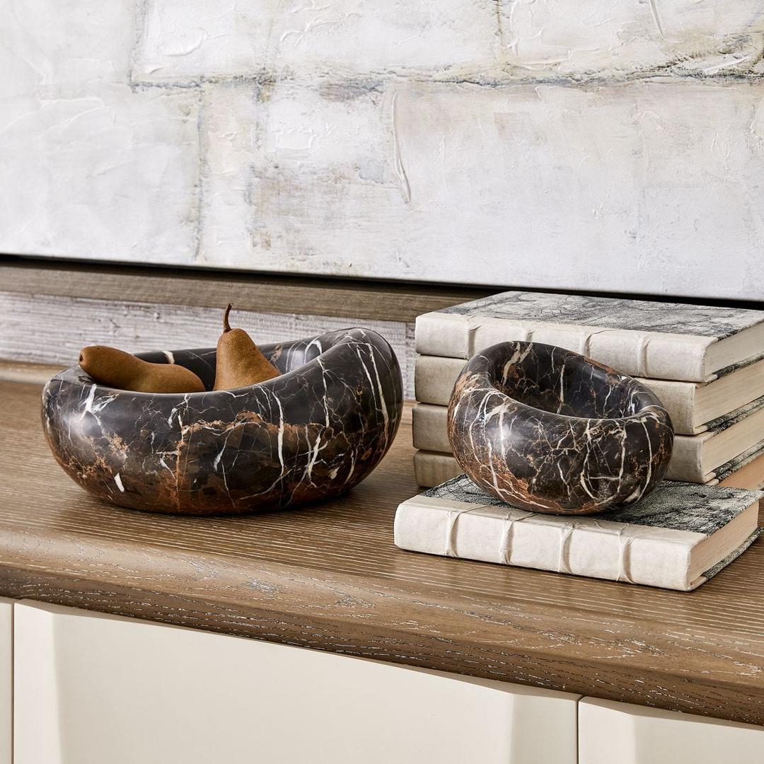 Набор из двух резных и вручную обработанных чаш из мрамора «Микеланджело» с мягкими, органичными скульптурными формами. Мрамор «Микеланджело» имеет глубокий темно-коричневый цвет с белыми и светло-бронзовыми прожилками. Из-за особенностей мрамора каждый предмет отличается, что гарантирует уникальность вашей чаши. Подходит для использования на открытом воздухе. Размеры: S – 8x4x6, L – 11x5x9.