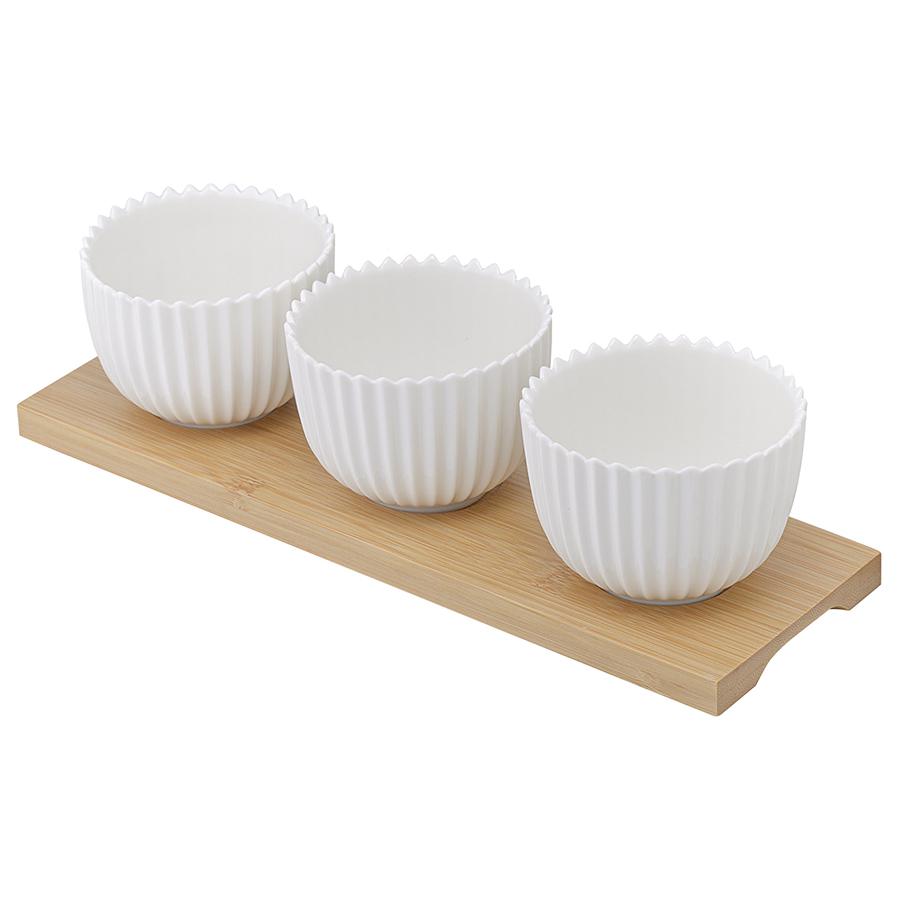 Набор для сервировки состоит из трех белоснежных фарфоровых чаш и подставки из полированного бамбука. Такой набор идеально подойдет для подачи закусок, соусов или сладостей к праздничному столу или семейному ужину. Глянцевая фарфоровая поверхность чаш имеет рифленую фактуру, что добавляет сервировке легкости и утонченности. При этом чаши очень практичны: не царапаются, не меняют цвет и легко моются. Этот набор прекрасно сочетается с другой посудой из коллекции Edge, в которой есть тарелки, чашки, салатники, сахарницы и другие предметы. Материал: фарфор, бамбук. Размеры чаши: 8х8х6 см. Размеры подставки: 9х28х1,5 см. Объем чаши: 150 мл. • Можно использовать в микроволновой печи • Можно мыть в посудомоечной машине • Можно использовать в духовке при температуре не более 180° C • Можно замораживать