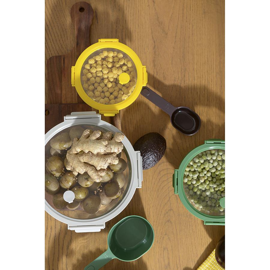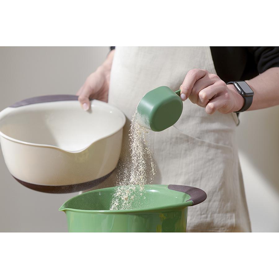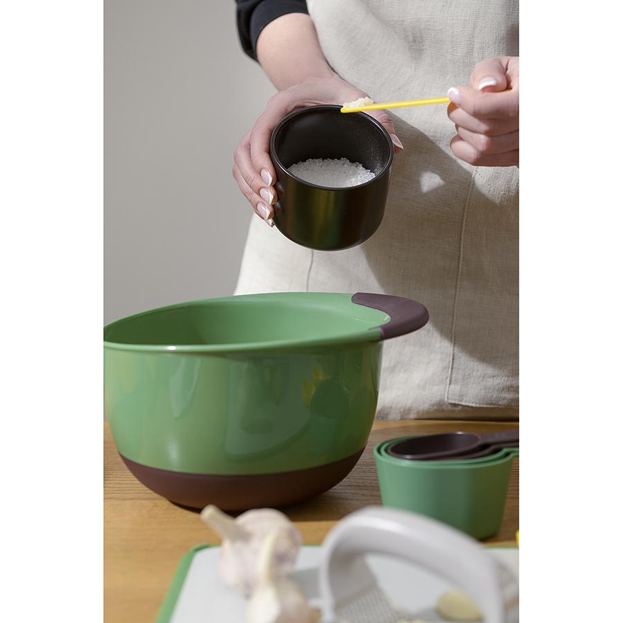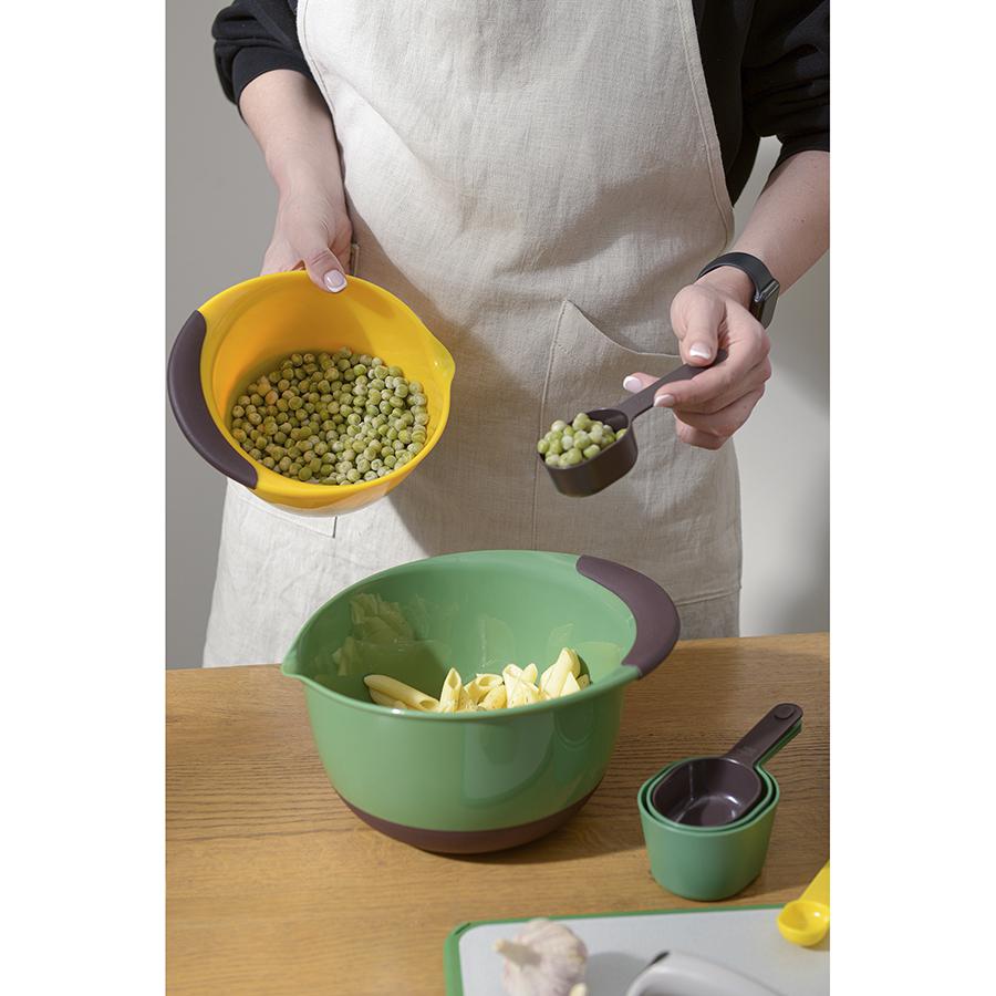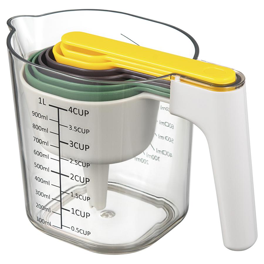 Набор из 9 предметов Gro включает в себя: мерный стакан, воронку и 7 ложек разных объемов. Такой комплект помогает четко соблюдать пропорции добавляемых ингредиентов, что существенно облегчает процесс приготовления различных блюд. Особенности и преимущества: - Мерный кувшин может использоваться как для жидких, так и для сыпучих продуктов. - Воронка позволяет аккуратно переливать жидкости, сохраняя в чистоте используемую под готовку поверхность. - Ложки разных объемов позволяют комфортно работать с различными продуктами. - Все элементы из комплекта удобно складываются для компактного хранения. Материалы: АБС-пластик, термопластичная резина, полистирол. Объемы ложек: 7,5 мл, 15 мл, 60 мл, 85 мл, 125 мл, 250 мл. Объем кувшина: 1 л. Количество предметов в наборе: 9 шт. Все предметы из набора можно мыть в посудомоечной машине.