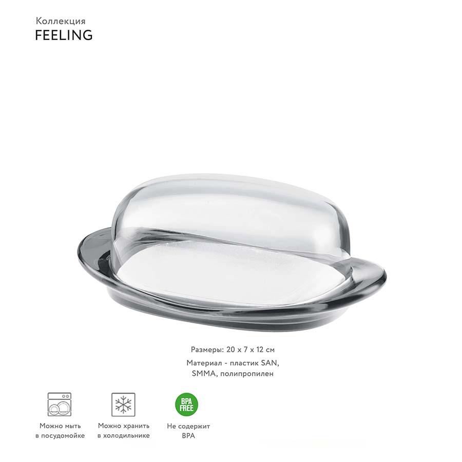Элегантная масленка Feeling состоит из цветной тарелки и прозрачной крышки. Ее размеры идеальны для хранения - она не займет много места на столе или в холодильнике. В закрытом положении крышка плотно прилегает к базе и не соскальзывает, что обеспечивает дополнительную безопасность при использовании. Отличное дополнение для городских и дачных завтраков. Можно мыть в посудомоечной машине в режиме деликатной мойки.