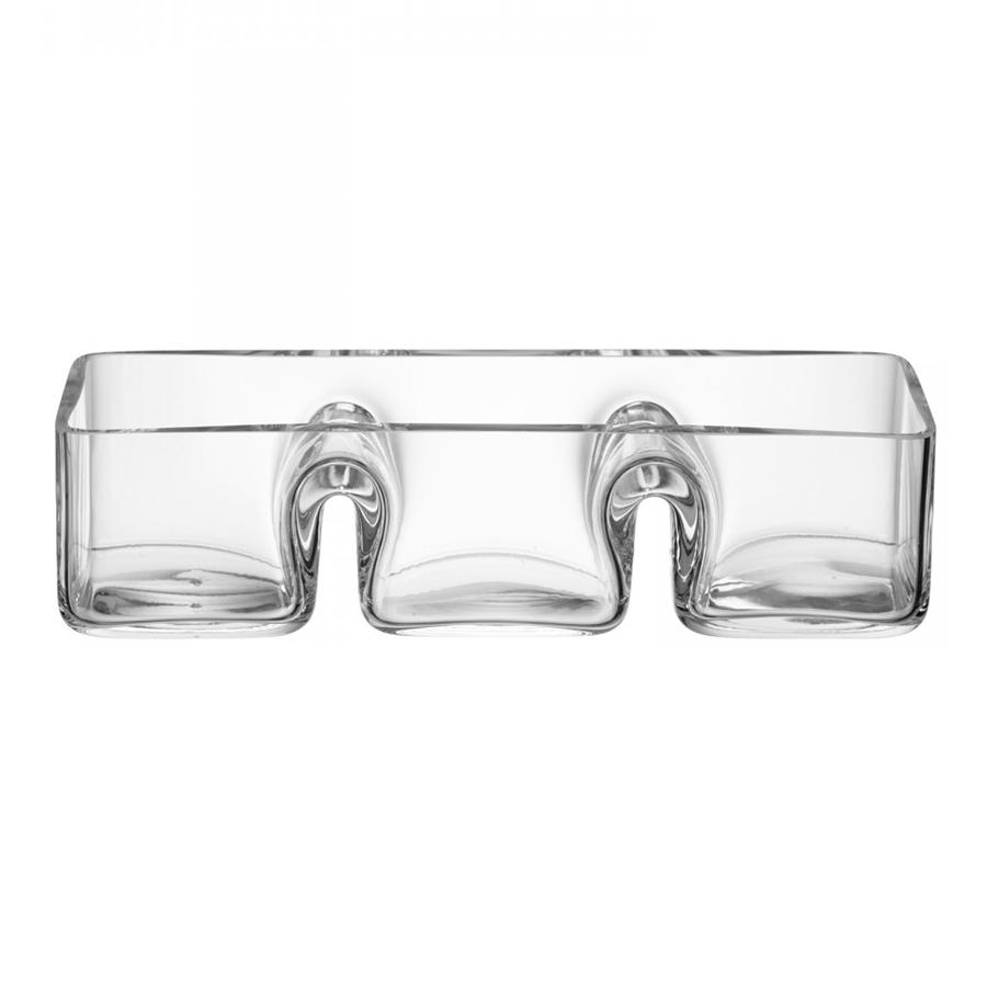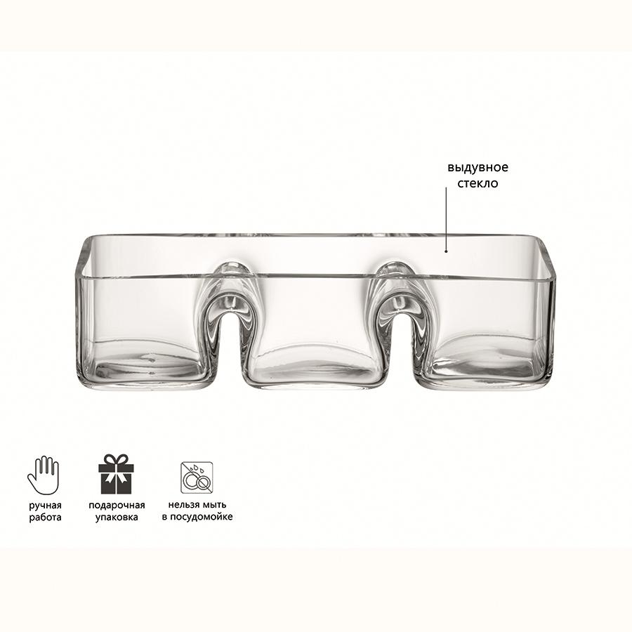 Менажница из стекла ручной работы идеально подойдет для сервировки оливок, орехов, сухофруктов, конфет, крекеров и других закусок. Классический дизайн делает ее универсальным столовым аксессуаром, который подходит для подачи самых разных блюд. Практичная и стильная деталь, которая придется по душе всем, кто любит устраивать домашние праздники. Serve — это элегантные формы, подчеркнутые кристальным блеском стекла ручной работы. Предметы коллекции подходят для сервировки в различных стилях. Линейка придется по душе всем, кто любит красивую и практичную посуду. Важно! Поскольку изделие изготавливается вручную, его размеры могут незначительно отличаться и допускается наличие пузырьков в толще стекла: круглые < 3 мм, овальные < 5 мм и их небольшие скопления в виде пены. Также возможно наличие прожилок (видимых нитей) на стекле менее 50% длины окружности любого предмета. Все это не брак, а допустимые индивидуальные особенности товаров, произведенных ручным способом. Материал: выдувное стекло. Длина: 30 см. Ширина: 11 см. Рекомендуется мыть вручную в теплой мыльной воде и вытирать насухо мягкой тканью.