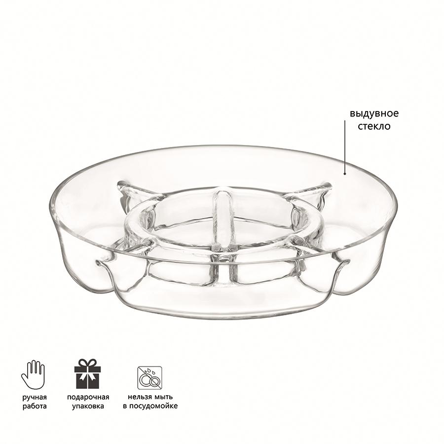 Менажница из стекла ручной работы идеально подойдет для сервировки оливок, орехов, сухофруктов, конфет, крекеров и других закусок. Классический дизайн делает ее универсальным столовым аксессуаром, который подходит для подачи самых разных блюд. Практичная и стильная деталь, которая придется по душе всем, кто любит устраивать домашние праздники. Serve — это элегантные формы, подчеркнутые кристальным блеском стекла ручной работы. Предметы коллекции подходят для сервировки в различных стилях. Линейка придется по душе всем, кто любит красивую и практичную посуду. Важно! Поскольку изделие изготавливается вручную, его размеры могут незначительно отличаться и допускается наличие пузырьков в толще стекла: круглые < 3 мм, овальные < 5 мм и их небольшие скопления в виде пены. Также возможно наличие прожилок (видимых нитей) на стекле менее 50% длины окружности любого предмета. Все это не брак, а допустимые индивидуальные особенности товаров, произведенных ручным способом. Материал: выдувное стекло. Диаметр: 35 см. Высота: 6 см. Рекомендуется мыть вручную в теплой мыльной воде и вытирать насухо мягкой тканью.