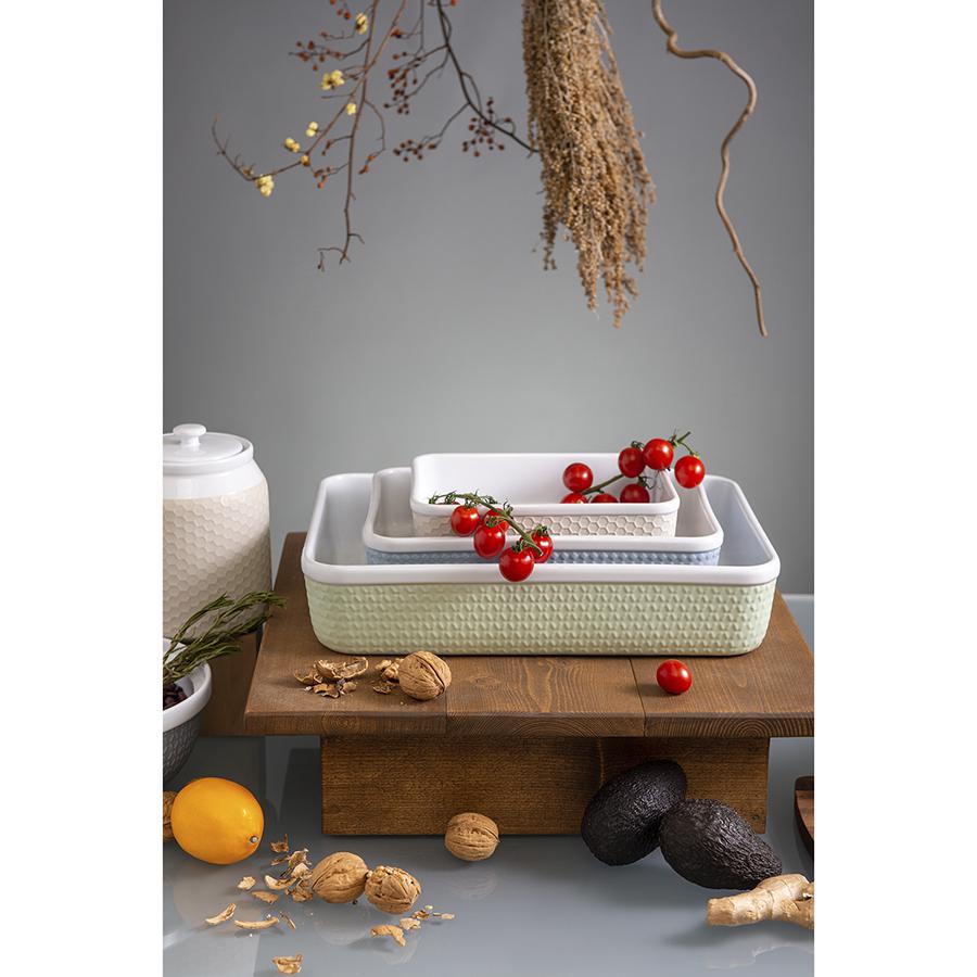 Коллекция посуды Marshmallow привнесет в ваш дом ощущение тепла, поможет создать идеальную атмосферу для приема гостей и уютных семейных застолий. Емкость для запекания Marshmallow – прекрасный вариант для приготовления в духовке десертов, а также блюд из рыбы, мяса и овощей. Изделие выполнено из высококачественной каменной керамики, покрытой специальной глазурью. Материал экологичный, имеет высокую степень устойчивости к повреждениям и легко моется, что делает эту посуду идеальным выбором для ежедневного использования. Наши продукты прошли испытания на отсутствие в составе свинца и кадмия в соответствии со стандартными тестами FDA. Материал: каменная керамика. Размеры: 37х26,8х7,5 см. Объем: 4,85 л. Цвет: мятный. Посуду рекомендуется очищать от загрязнений в теплой воде с помощью мягкой губки с жидким средством. Допускается мытье в посудомоечной машине, использование в морозильной камере, микроволновке, духовке при температуре до 230 °C.