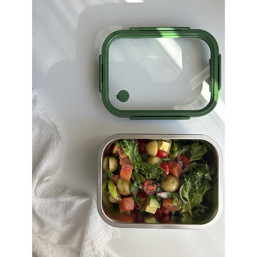 Ланч-бокс из нержавеющей стали – стильная, практичная и надежная посуда для хранения и переноски еды. Особенности и преимущества: - Емкость из нержавеющей стали типа 18/10 не боится коррозии, не впитывает запахи и загрязнения, долго сохраняет привлекательный вид. - Крышка из прочного боросиликатного стекла легко выдерживает перепады температуры, имеет специальные фиксаторы, которые помогают избежать протечек. - Наличие вентиляционного отверстия позволяет выпустить из контейнера лишний воздух или горячий пар, что повышает герметичность и улучшает условия хранения продуктов. - Благодаря компактным размерам ланч-бокс не занимает много места в сумке или рюкзаке. Материал: нержавеющая сталь 18/10, боросиликатное стекло, пластик. Размеры: 16х21х8 см. Объем: 1,2 л. Цвет: зеленый. Ланч-бокс можно мыть вручную и в посудомоечной машине (без крышки). Запрещается использование абразивов и агрессивной бытовой химии. Известковый налет с поверхности рекомендуется удалять при помощи раствора теплой воды с белым уксусом или пищевой содой, после чего контейнер требуется вытереть насухо. Для разогрева еды в микроволновке или духовке при температуре не более 420 °C необходимо снимать крышку, чтобы избежать деформации. Не допустим нагрев на открытом огне. Можно подвергать заморозке.