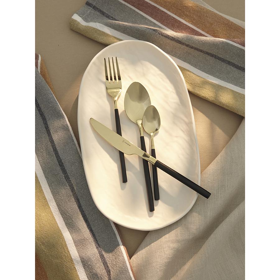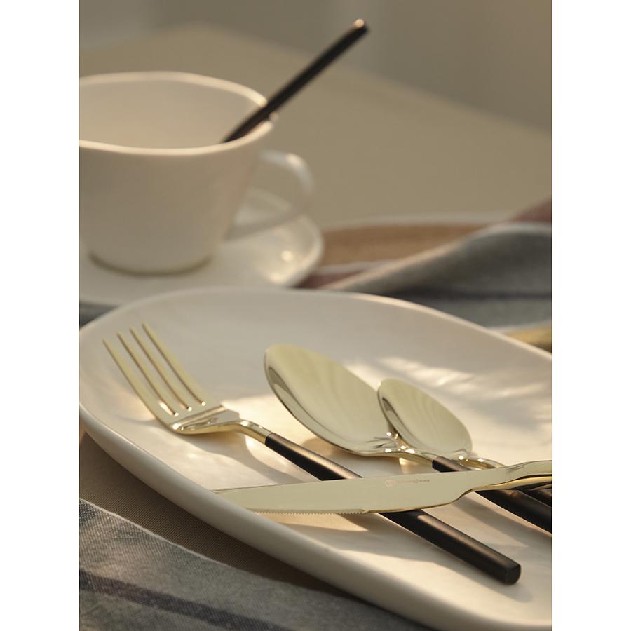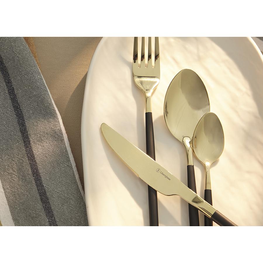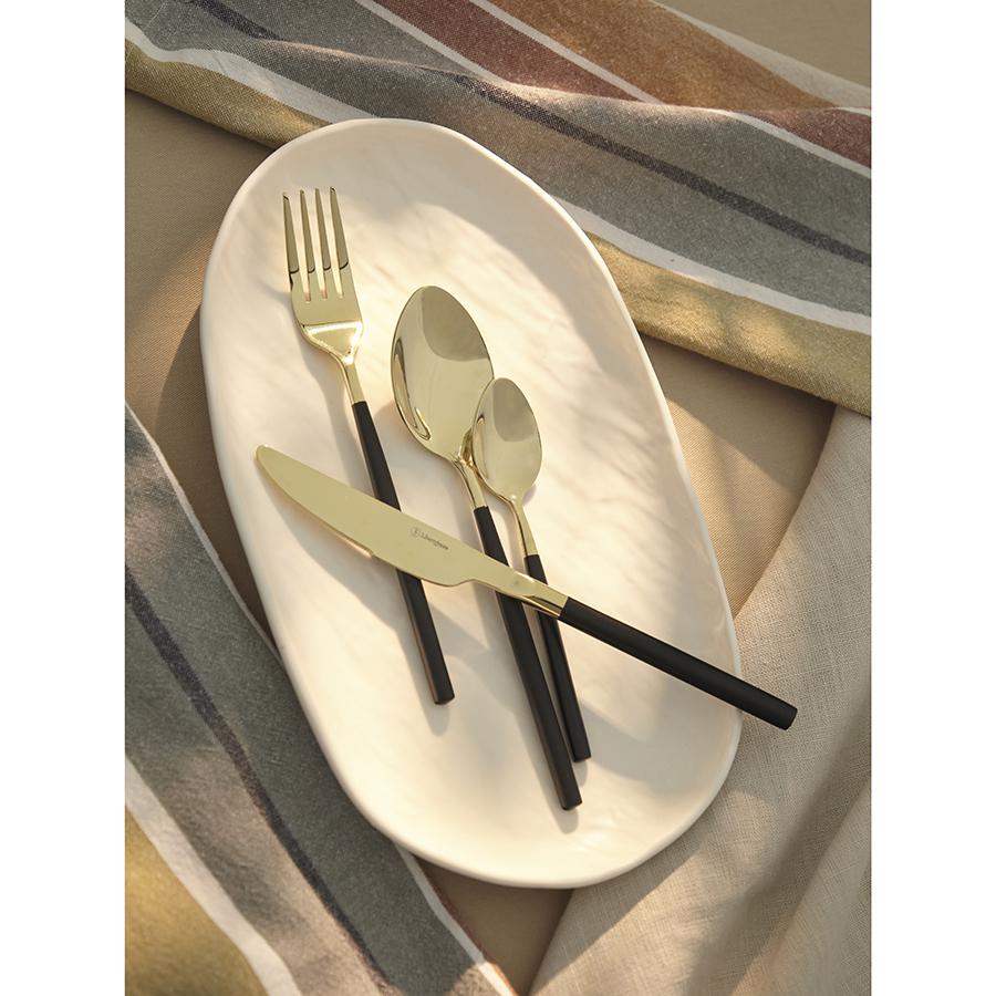 Столовые приборы Duality золотистого цвета с черными ручками украсят любую сервировку и подчеркнут вашу любовь к красивым предметам. Набор включает: 4 ножа, 4 вилки, 4 столовые ложки и 4 чайные ложки. Особенности и преимущества: - Все приборы изготовлены из высококачественной нержавеющей стали 18/10, благодаря чему долго служат, сохраняя первозданный вид. - Лезвия ножей из нержавеющей стали 13/0 обладают устойчивостью к механическим повреждениям и долго остаются острыми. - Рабочая часть приборов имеет прочное и износостойкое титановое покрытие, которое при этом является самым безопасным. - Отличительная особенность серии – цветные ручки из эмалированной стали, которые добавляют в сервировку яркий акцент. Материалы: нержавеющая сталь 304 (18/10), нержавеющая сталь 13/0. Длина ножа: 22,3 см. Вес ножа: 84 г. Длина вилки: 20 см. Вес вилки: 65 г. Длина ложки: 20,7 см. Вес ложки: 81 г. Длина чайной ложки: 15 см. Вес чайной ложки: 42 г. Цвет: золотистый/черный. Количество предметов в наборе: 16 шт. Приборы рекомендуется мыть вручную.