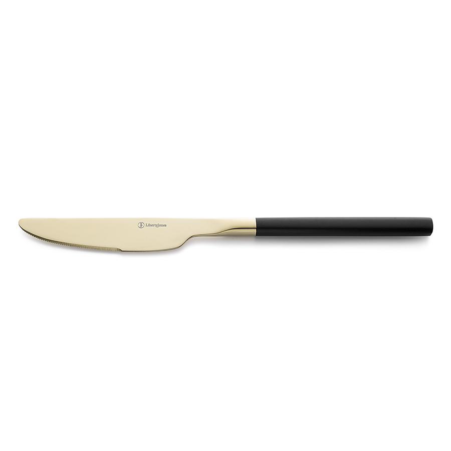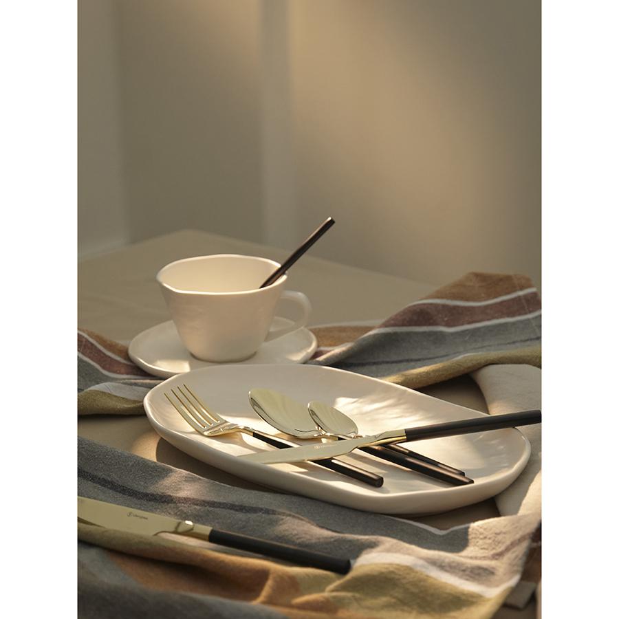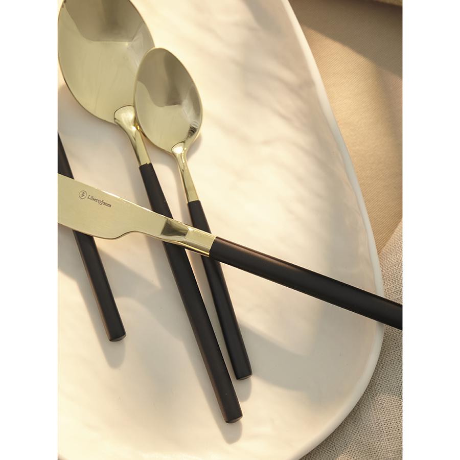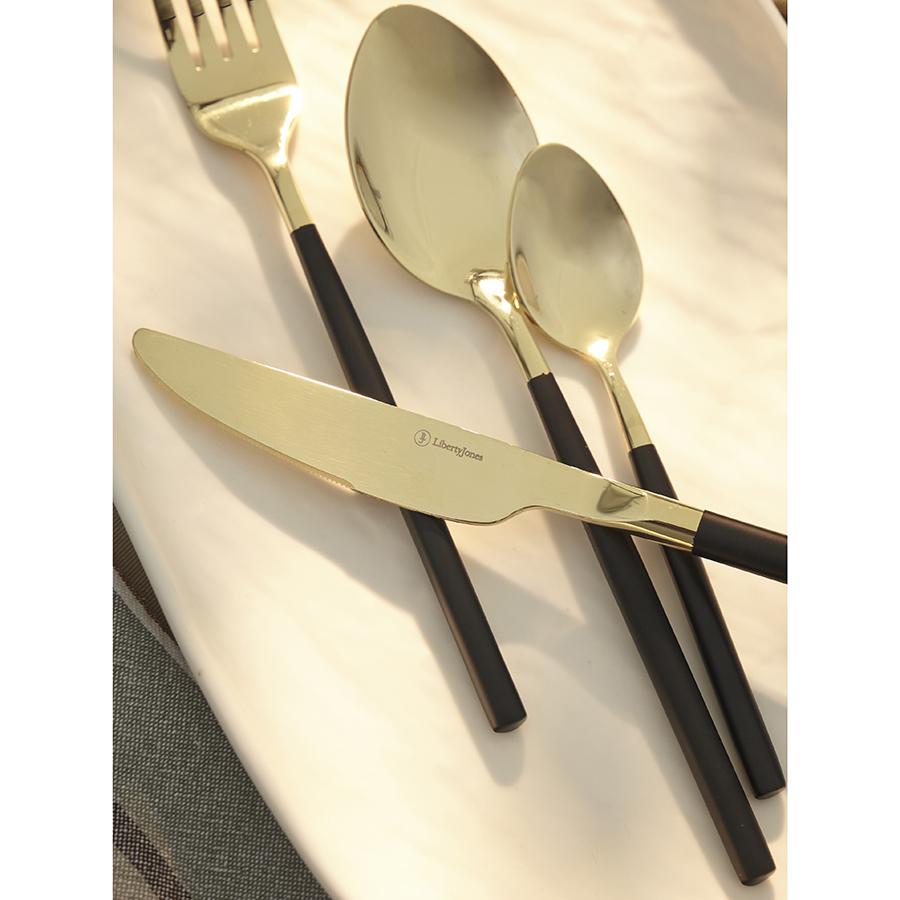 Столовые приборы Duality золотистого цвета с черными ручками украсят любую сервировку и подчеркнут вашу любовь к красивым предметам. Набор включает: 4 ножа, 4 вилки, 4 столовые ложки и 4 чайные ложки. Особенности и преимущества: - Все приборы изготовлены из высококачественной нержавеющей стали 18/10, благодаря чему долго служат, сохраняя первозданный вид. - Лезвия ножей из нержавеющей стали 13/0 обладают устойчивостью к механическим повреждениям и долго остаются острыми. - Рабочая часть приборов имеет прочное и износостойкое титановое покрытие, которое при этом является самым безопасным. - Отличительная особенность серии – цветные ручки из эмалированной стали, которые добавляют в сервировку яркий акцент. Материалы: нержавеющая сталь 304 (18/10), нержавеющая сталь 13/0. Длина ножа: 22,3 см. Вес ножа: 84 г. Длина вилки: 20 см. Вес вилки: 65 г. Длина ложки: 20,7 см. Вес ложки: 81 г. Длина чайной ложки: 15 см. Вес чайной ложки: 42 г. Цвет: золотистый/черный. Количество предметов в наборе: 16 шт. Приборы рекомендуется мыть вручную.