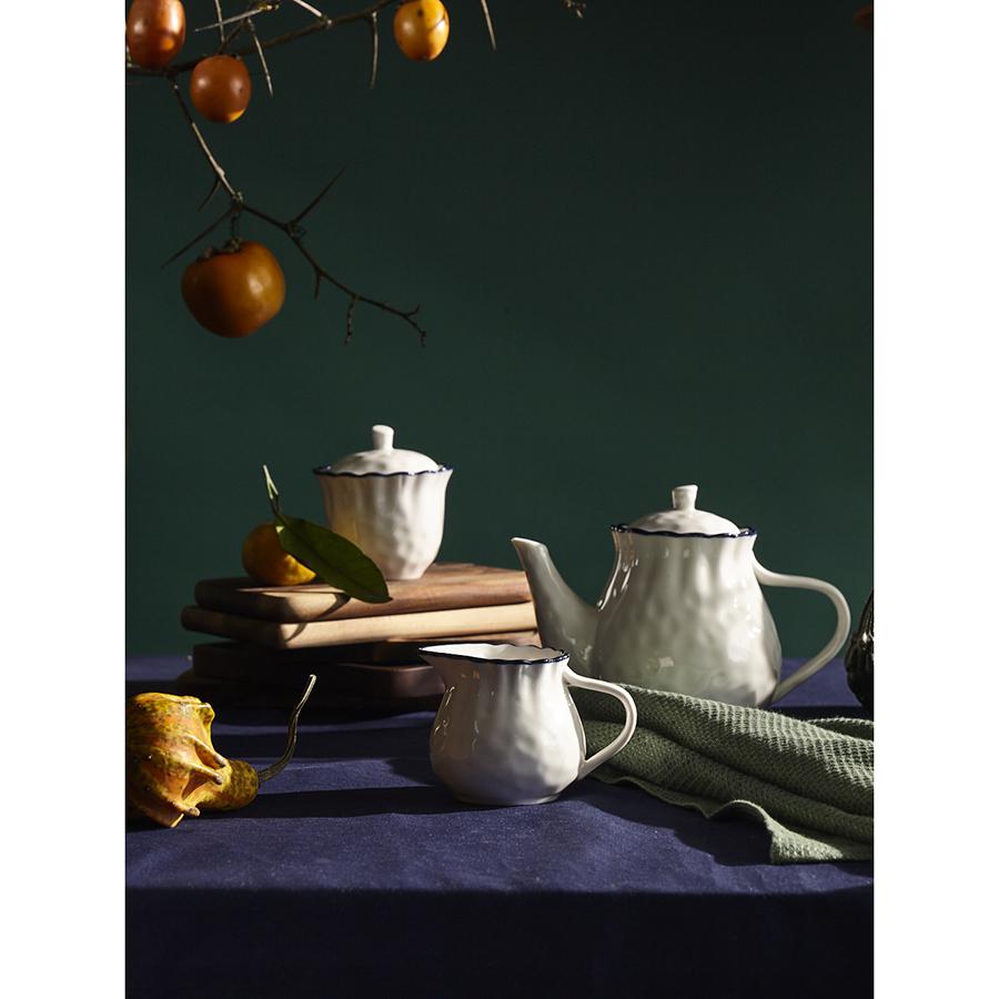 Молочник из коллекции Santorini от бренда Liberty Jones воплощает в себе элегантность посуды из фарфора, привлекая необычным дизайном с контрастными акцентами. Особенности и преимущества: - Фарфор является прочным, устойчивым к износу материалом, который сохраняет презентабельный вид долгие годы. - Молочник имеет удобную форму с зауженной верхней частью, что позволяет аккуратно наливать сливки или молоко, не пачкая стол. - Акцент в виде контрастной каймы и легкий рельеф делают дизайн интересным и запоминающимся. - Идеально гладкая поверхность и высокая сопротивляемость материала к химическим воздействиям обеспечивают простой уход. - Белая посуда отлично гармонирует с предметами сервировки любой цветовой гаммы. Коллекция Santorini великолепно передает атмосферу уединенного греческого острова, известного своими завораживающими видами и удивительной архитектурой. Оттенки белого и синего напоминают о бескрайнем море и уютных домиках на скалах, а необычная “мятая” фактура фарфора ассоциируется с каменистыми склонами и живописными утесами. Материал: фарфор. Размеры: 11,7х8,4х8 см. Объем: 250 мл. Можно мыть в посудомоечной машине, замораживать, использовать в микроволновой печи и духовке при температуре не более 180° C.