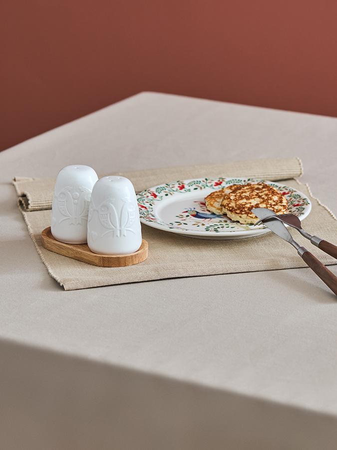 Набор для соли и перца на деревянной подставке из коллекции Birds of Paradise украсит интерьер кухни и сделает любую сервировку особенной. Особенности и преимущества: - Изделия выполнены из высококачественного фарфора – прочного, экологичного, устойчивого к износу и не подверженного старению материала. - Покрытие глазурью упрощает уход, обеспечивает декоративность и дополнительную защиту от внешних воздействий. - Подставка из натурального дерева позволяет удобно хранить набор и красиво подавать к столу соль и перец. Коллекция Birds of Paradise разработана английской художницей Karen Wall, основным направлением творчества которой является создание иллюстраций для посуды, домашнего текстиля и детских книг. В основе дизайна – природные мотивы, вдохновленные традиционным фольклором Великобритании 19-го века. Атмосфера волшебного леса с райскими птицами погружает в мир добрых грез и фантазий, где всегда тепло, уютно и есть место чудесам. Наши продукты прошли испытания на отсутствие в составе свинца и кадмия в соответствии со стандартными тестами FDA. Материалы: фарфор, каучуковое дерево. Размеры солонки и перечницы: диаметр низа – 5,9 см; диаметр верха – 4 см; высота – 7,8 см. Размеры подставки: 13,5х13,5х1,2 см. Солонку и перечницу можно мыть в посудомоечной машине. Подставку можно мыть вручную с помощью мягкой губки. После очищения ее необходимо сразу протереть сухой тканью и поставить на хранение в хорошо проветриваемое место. Запрещается замачивать и мыть изделие из натурального дерева в посудомоечной машине.