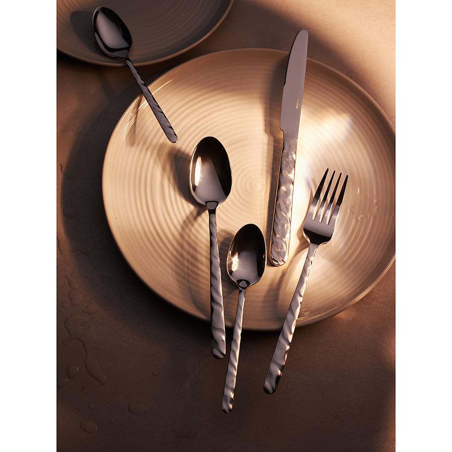 Столовые приборы Fluid – великолепное сочетание элегантного дизайна и функциональности. Сияние зеркальной полировки и плавные, обтекаемые формы делают их настоящим украшением стола. Набор состоит из 16 предметов и включает все необходимое для обслуживания 4-х человек. Особенности и преимущества: - Сталь 18/0 отличается высокой стойкостью к коррозии и износу, что гарантирует изделиям из нее практичность и долговечность. - Лезвия ножей из нержавеющей стали 13/0 устойчивы к механическим повреждениям и деформации, долго остаются острыми. - Зеркальная полировка не только придает блеск, но и облегчает уход за приборами, позволяя легко удалять с их поверхности пятна и отпечатки пальцев. - Ручки, украшенные объемным узором, делают дизайн оригинальным и обеспечивают приятные тактильные ощущения. Материалы: нержавеющая сталь: 430 (18/0), нержавеющая сталь 13/0. Размеры: Нож: длина – 23,7 см; ширина – 1,9 см; толщина – 7 мм; вес – 108,3 г. Вилка: длина – 20,2 см; ширина – 2,6 см; толщина – 3 мм. Ложка: длина – 20 см; ширина – 3,7 см; толщина – 4 мм. Чайная ложка: длина – 16,5 см; ширина – 3,4 см; толщина – 3 мм. Цвет: серебристый. Количество предметов в наборе: 16 шт. Приборы можно мыть в посудомоечной машине. Не использовать в микроволновке и на открытом огне.