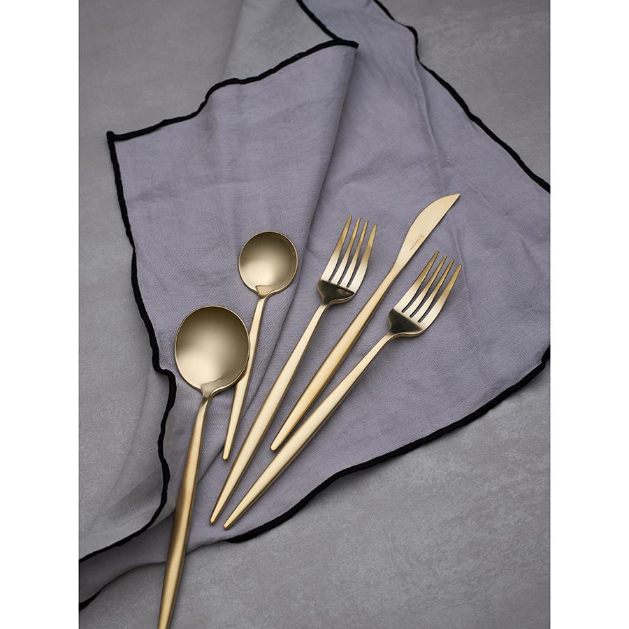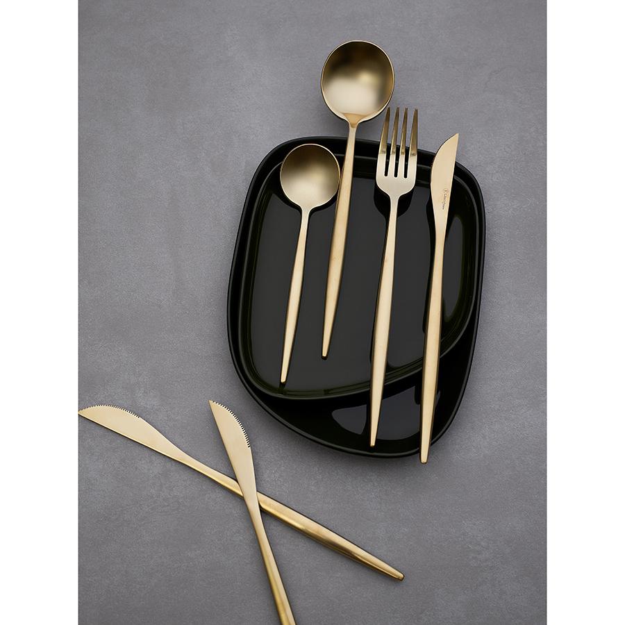 Столовые приборы Globe от дизайнерского бренда Liberty Jones сделают любую сервировку более стильной и утонченной, а каждый прием пищи – особенным. Набор состоит из 16 предметов и включает все необходимое для обслуживания 4-х человек. Особенности и преимущества: - Изделия из высококачественной нержавеющей стали 18/10 отличаются долговечностью и стойкостью к коррозии. - Лезвия ножей изготовлены из нержавеющей стали 13/0, благодаря чему обладают устойчивостью к механическим повреждениям и долго остаются острыми. - Рабочая часть приборов имеет прочное и износостойкое титановое покрытие, которое при этом является самым безопасным. - Округлые формы придают приборам элегантный и в то же время интересный вид. - Аксессуары золотистого цвета привносят в сервировку нотки роскоши и благородства. Материалы: нержавеющая сталь 304 (18/10), нержавеющая сталь 13/0. Размеры: Нож: длина – 22,6 см; ширина – 1,5 см; толщина – 7 мм; вес – 61 г. Вилка: длина – 22,2 см; ширина – 2,6 см; толщина – 2 мм; вес – 69 г. Ложка: длина – 21,5 см; ширина – 4,9 см; толщина – 2 мм; вес – 84 г. Чайная ложка: длина – 15,9 см; ширина – 4 см; толщина – 2 мм; вес – 40 г. Цвет: золотистый матовый. Количество предметов в наборе: 16 шт. Приборы рекомендуется мыть вручную.